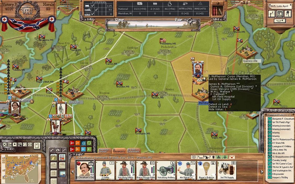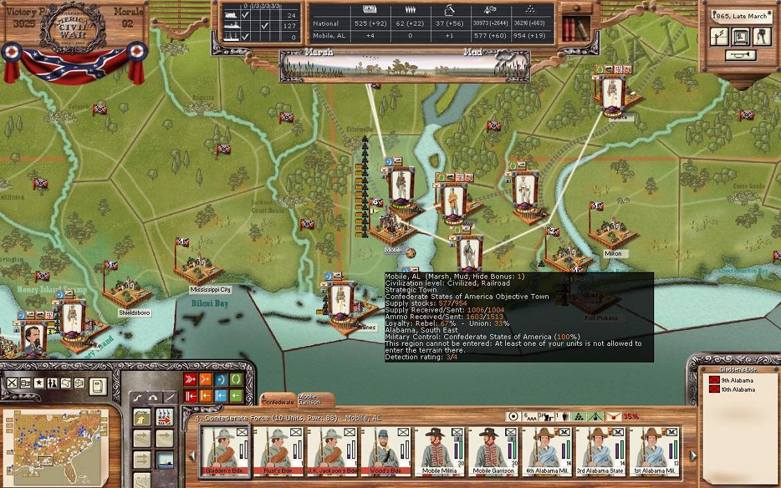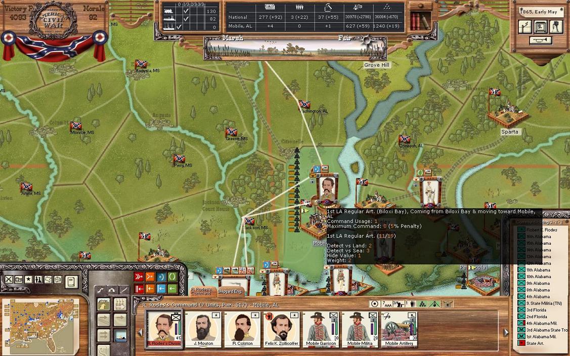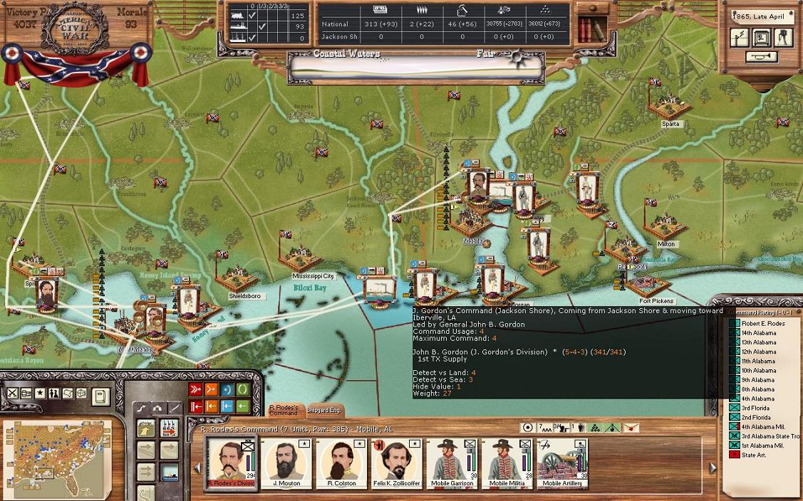 As mentioned before, General Rhodes will go to Mobile AL to take over the defences there. I’m currently building four small infantry brigades in Mobile (8 regiments in total) in additional to the decent-sized Mobile force locked there. Once I get a couple more batteries there, this will be a nearly full-sized division.