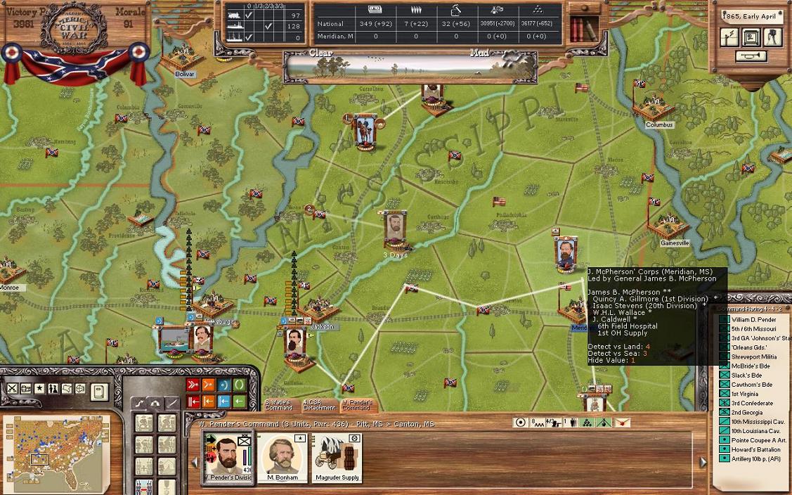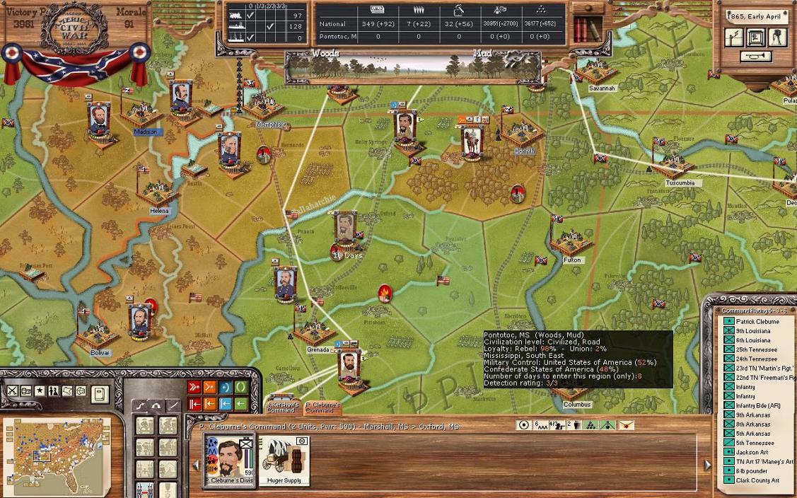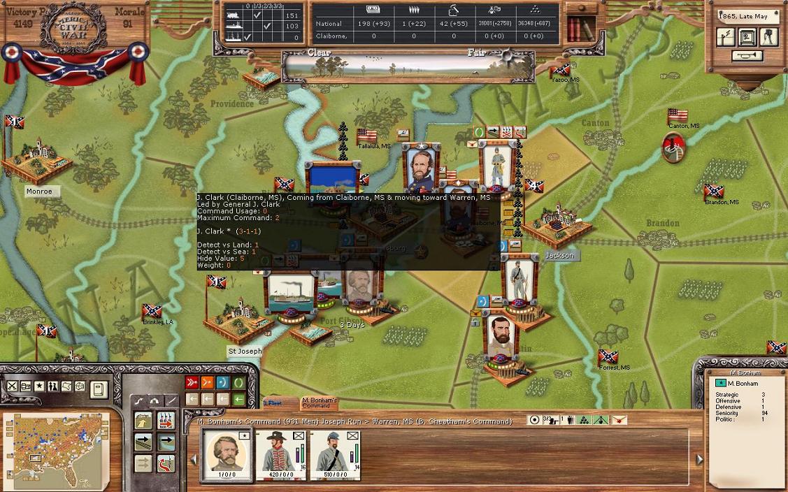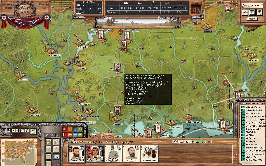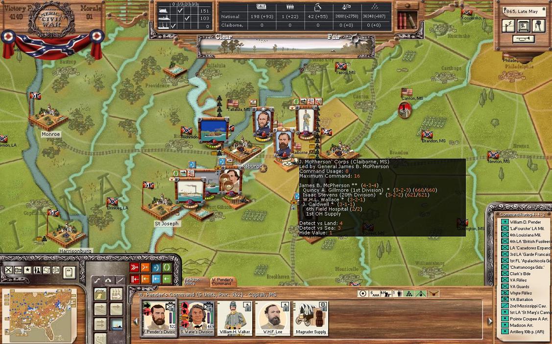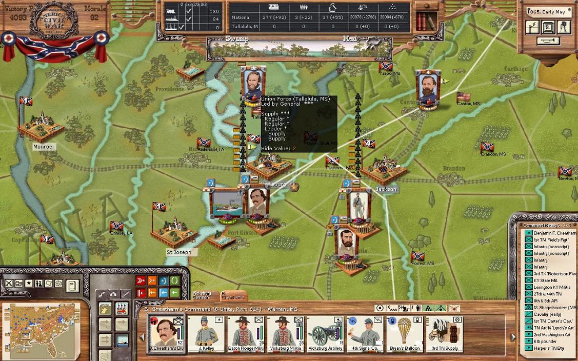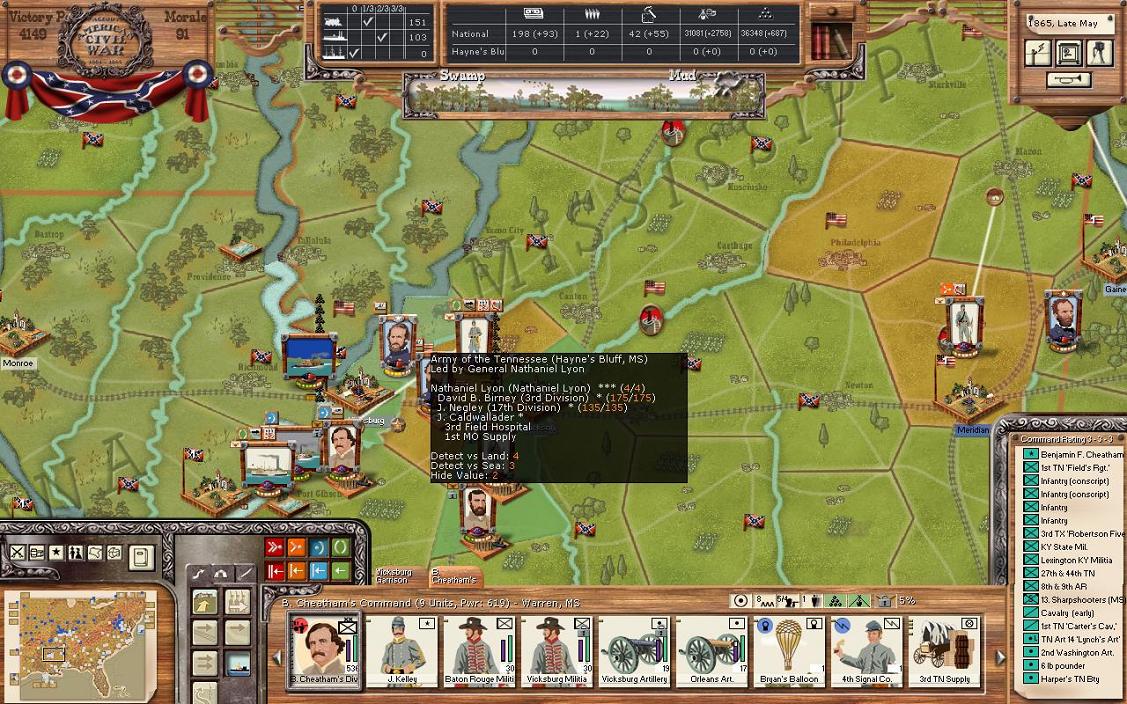 On to Mississippi, there is quite a bit to talk about here, including the headline at the beginning of this post. First, I’ll get the easy items out of the way. My Sharpshooter unit fixed the RR in Monroe and will head back to Vicksburg. My militia unit took the harbour of Providence LA and will head back to Vicksburg. A lot has happened in this region with regards to Union movement. Clearly, Mortar wants to make something happen during the last year of the war. In a move that really shocked me, the Union has blown the depot in Corinth and evacuated the town. I confess, I really didn’t see that coming. There seems to be a general southern movement of Union forces away from the objective city of Memphis, also a surprise to me. However, it is possible the Union could turn around for a coordinated assault on Memphis. Okay, point by point, here is what happened. McPherson’s Corps of 2 divisions in Corinth blew the depot, evacuated the town and went SW to Pontotoc MS. Foster’s corps left Austin MS (SW of Memphis) and crossed the Tallahatchie river into Oxford MS. I don’t know if Foster’s corps is 1 division or more as it has a high hide value (possibly lots of cavalry?) What this does is put 2 corps between Cleburne’s strong force in Marshall MS and Watie’s light division in Grenada MS. If that weren’t enough to think about, there is more. Lyon’s (Army of the TN) has refitted, left Little Rock and gone by boat to Bolivar; Lyon’s army is 2 divisions. At first glance, this appears to be a move on Grenada. However, the Union forces could use ships to go down the Tallahatchie or Mississippi Rivers; which would bring them close to Vicksburg (objective) or Jackson MS which is more strategic than Grenada. What to do? First. I’m not going to send a division into Corinth straight away. The Union could double back and meet me with 3-4 divisions. I’ll send a cavalry regiment from Marshall MS. Pender’s division will leave Jackson MS and go north to Grenada. That will put 2 divisions in place there, with Pender taking over command. As that leaves Jackson open, Gordon will go north to take over the defences in Jackson. This covers Vicksburg, Grenada, and Jackson with some stout defence (about 30,000 men in all) with trenches of 7 to 8. To block any movement south of Vicksburg via the Mississippi river, the Mississippi fleet will take up a position in Joseph Run.