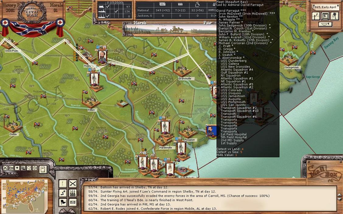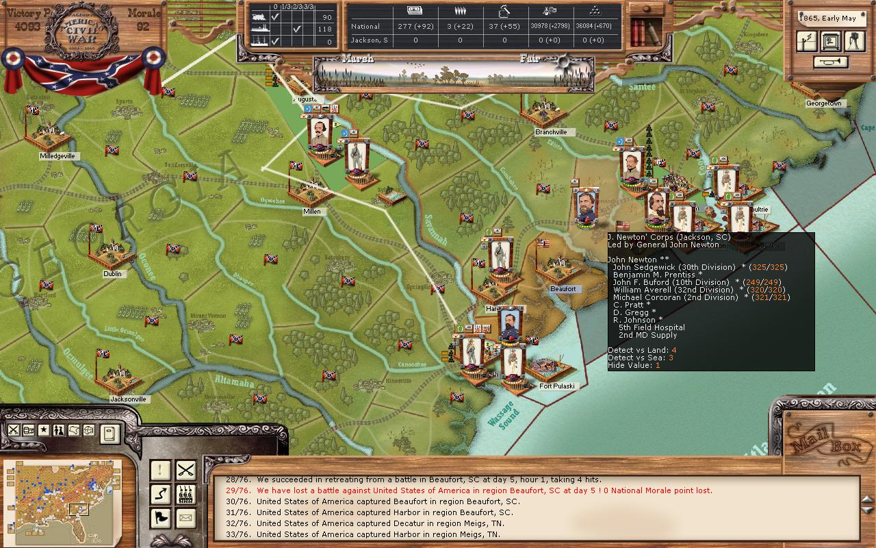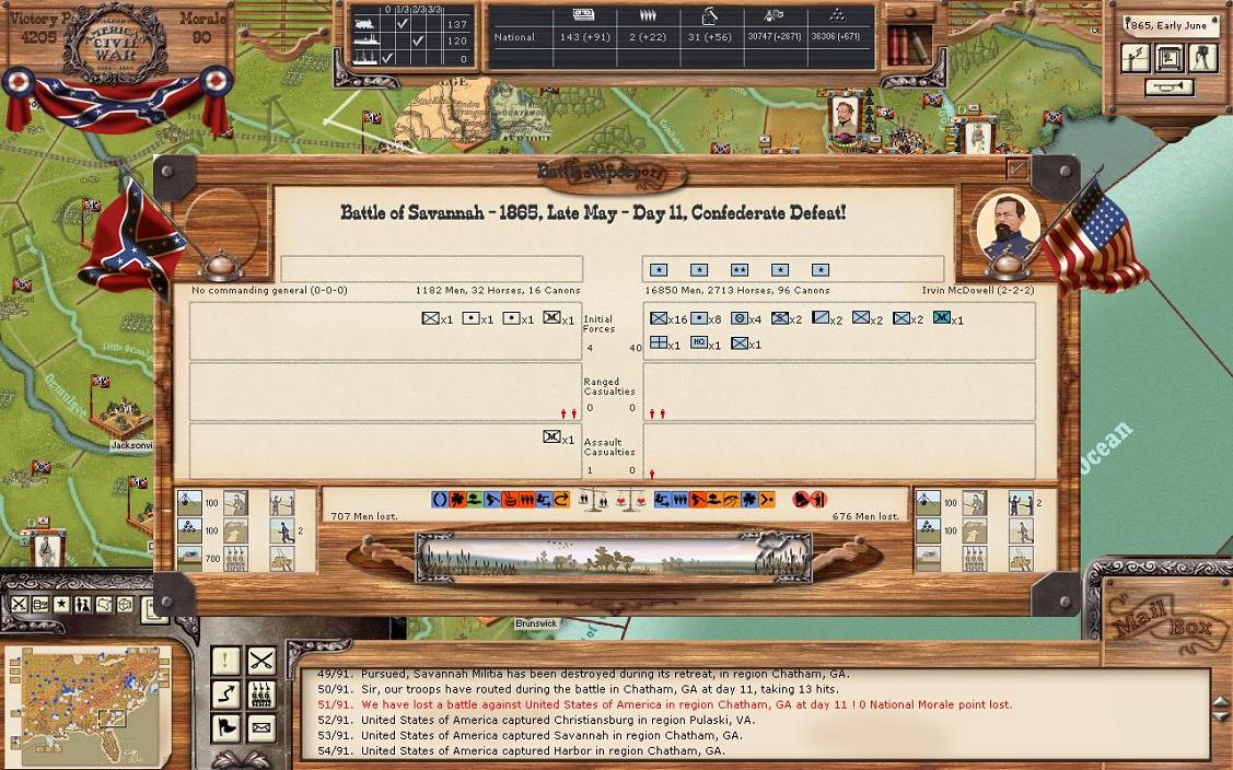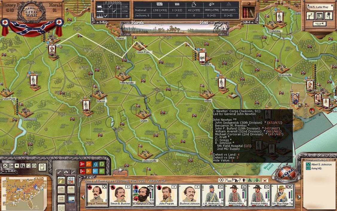 I think the Union has been frustrated in this campaign. First, losing the battle in Charlestown, then it took a couple turns to secure Savannah. The Union has now built a depot in Savannah and the Union fleet is harboured there. However, Ft. Pulaski is still garrisoned by the CSA. If I’m not mistaken, this will block naval supply from reaching the Savannah depot. Of course, Savannah will produce some supply, but it won’t be enough for 6 divisions. The map shows Newton’s corps in Beaufort SC, but actually they are going towards Savannah and have nearly arrived. At this point, I think the Union refits in Savannah before going back at Charlestown, or possibly Atlanta. Beauregard is away in Wilmington, leaving the Charlestown defences with about 10,000 men. Atlanta is held by a hold force led by AS Johnston of about 3,000 men. At this point, CSA strategy is to his Foster’s corps in Corinth and Sherman’s corps in Montgomery this turn. Next turn hit Sheridan, and then be back to defend Atlanta, Charlestown, or some other priority.