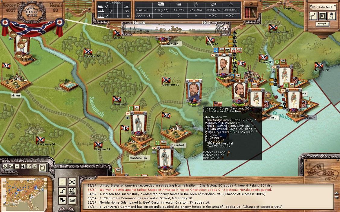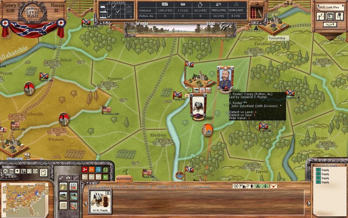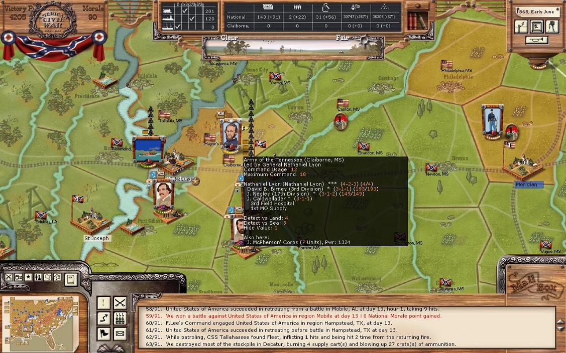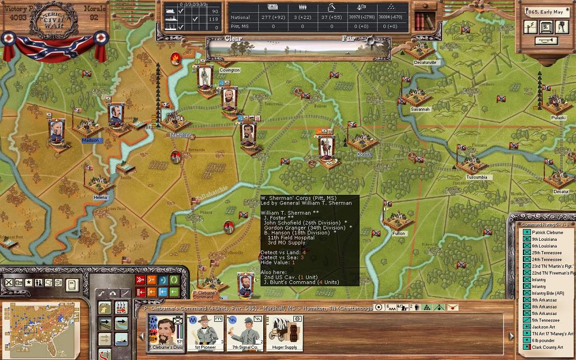 I think the Union has been frustrated in this campaign. First, losing the battle in Charlestown, then it took a couple turns to secure Savannah. The Union has now built a depot in Savannah and the Union fleet is harboured there. However, Ft. Pulaski is still garrisoned by the CSA. If I’m not mistaken, this will block naval supply from reaching the Savannah depot. Of course, Savannah will produce some supply, but it won’t be enough for 6 divisions. The map shows Newton’s corps in Beaufort SC, but actually they are going towards Savannah and have nearly arrived. At this point, I think the Union refits in Savannah before going back at Charlestown, or possibly Atlanta. Beauregard is away in Wilmington, leaving the Charlestown defences with about 10,000 men. Atlanta is held by a hold force led by AS Johnston of about 3,000 men. At this point, CSA strategy is to his Foster’s corps in Corinth and Sherman’s corps in Montgomery this turn. Next turn hit Sheridan, and then be back to defend Atlanta, Charlestown, or some other priority.