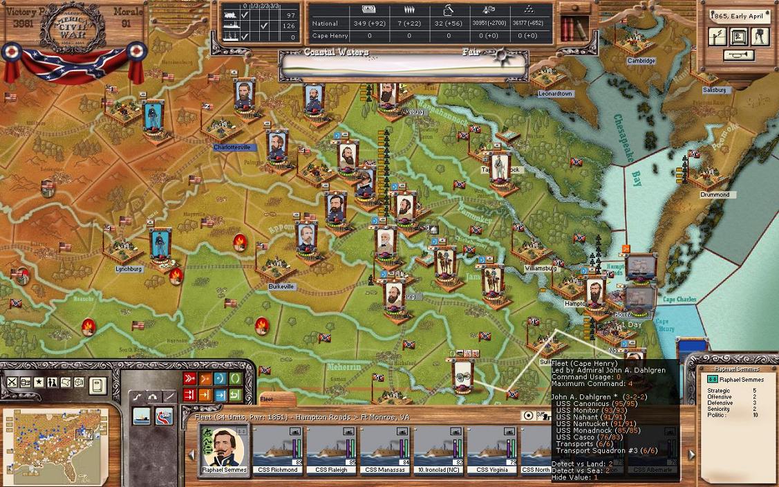 There was only 1 small Union movement on land, another brigade arrived in Manassas. What was more interesting is that a Union fleet led by Admiral which has 5 ironclads and 2 transports was turned back at Hampton Roads. This leaves the port of Norfolk open for business (blockaded cities have reduced production 50% less?). I’m making 1 move. The CSA fleet will target Dahlgern on conservative attack. I don’t see how the Union can take Richmond with the current forces there. General Wilcox has arrived in Norfolk, but he isn’t active this turn which means he can’t form a division.