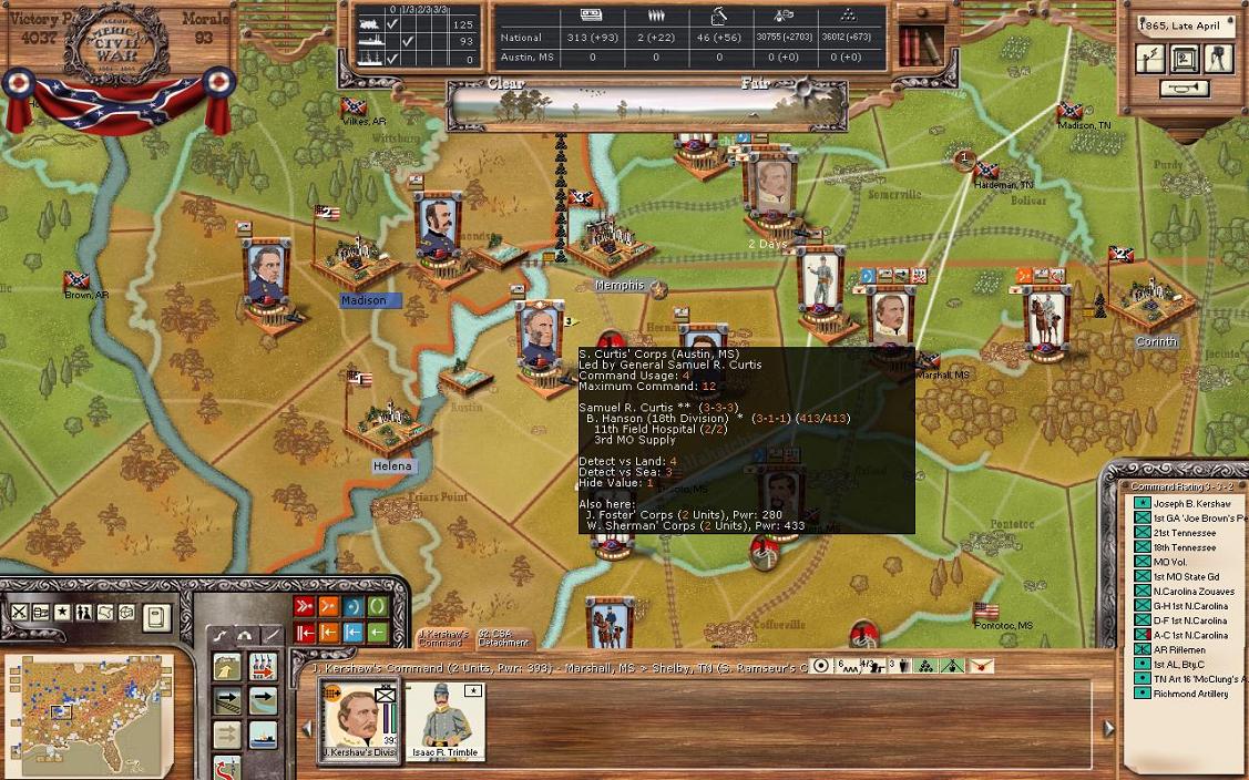 There were 2 moves in Kentucky, both of which were rather significant. The first is the Union corps I talked about last time in Columbus KY has moved 1 region to the east to Graves KY. The Union left a small division (power 312) in Columbus to hold that position. The combined Union corps in Graves, led by General Wallace, now has power of about 2,730, or around 35,000 men. This is a significant force, especially if an attack is coordinated with Grant’s 2 divisions in Ft. Henry. Now, I was moving some forces to reinforce AP Hill’s corps and Magruder’s corps. It seems I made a rather large mistake by sending the forces from Nashville through Waverly Run via river movement. They were bombarded by Ft. Henry and received 51 hits, which I presume destroyed them. It just shows that I still don’t know exactly how the bombard function works in relation the double adjacency rule, as Waverly Run appeared to be south of Ft. Henry. However, there is a bit in the north that touches the Ft. Henry land, which perhaps then makes it a viable bombard target. Since this AAR is supposed to be for new players as well, perhaps a veteran here would like to put a comment of the best explanation of the double adjacency rule and how to know if a region is subject to it? Moving, on, my other forces from Memphis did arrive to reinforce these corps. AP Hill’s corps has power of 1,029, but Magruder’s is only 785. I’m going to send the Kershaw’s small division in Memphis (power 163) to Magruder. This will bring that force close to 1,000 power. That puts the odds 2.5 to 1 in favour of the Union without MTSG. However, with level 8 trenches, I believe that will be enough to hold the position. Memphis will be left with a full division.