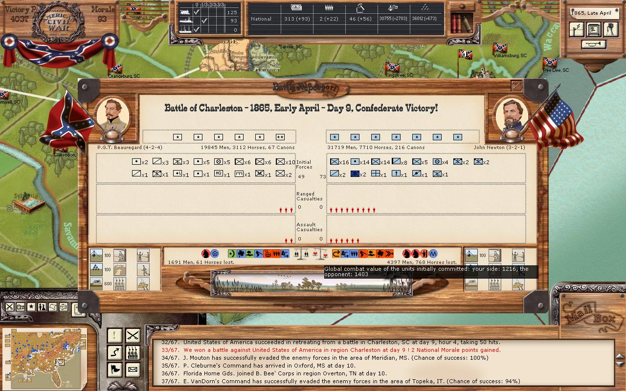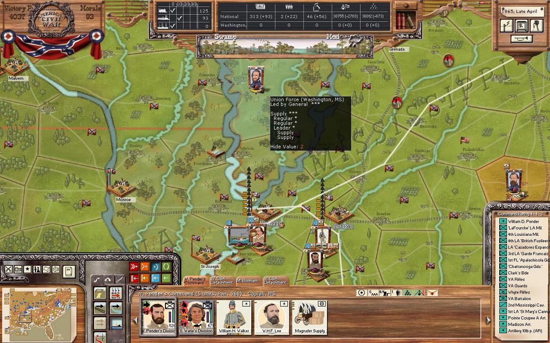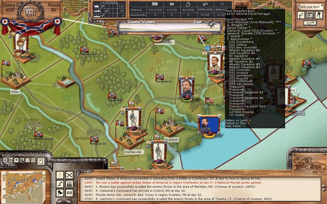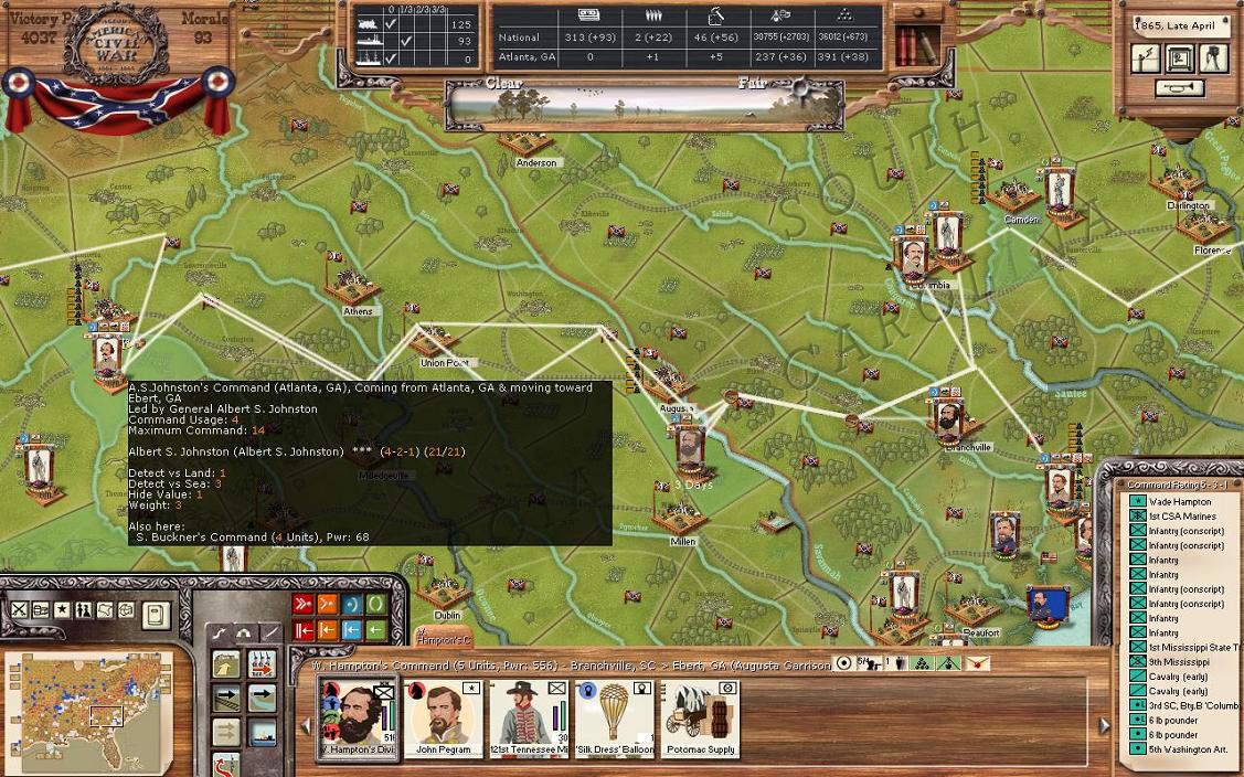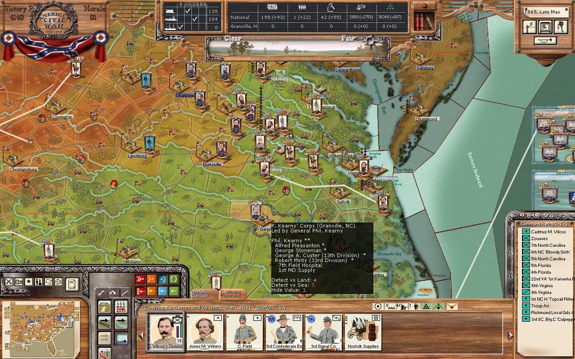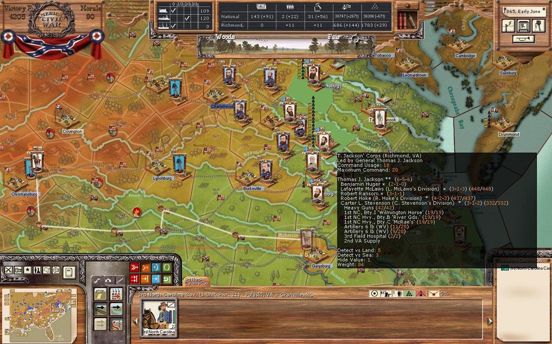 And here is the large Union fleet with an army off the coast of SC. There seems to be 2 three star generals and 2 two star generals along with many regulars and leaders. There is no detailed information though. I’m assuming as I’m sure you are that this is the army that left Manassas a turn ago unless it is a master ruse! What does this mean for the CSA? Well, it isn’t good, that is for sure. By clicking on the strategic icon, you and I can see there are many more strategic locations than I have forces to man. In particular, Wilmington and Savannah would be big losses. Why defend Charlestown? It’s an objective city, which means in game turns I would take a NM loss if I lose the town. It also produces money, CS, WS, and quite a lot of GS. For me to defend Charlestown, I think I will be able to field about 20,000 men. Edward Johnson’s corps will leave NC and head to Charlestown with 7,500 men. From what is in Charlestown including being built there is 5,000 men. Wheeler will provide another 5,000 men. Finally, there are a couple other brigades being built nearby. The Charlestown defences are already level 6. Since Charlestown generates 105 per turn and could feed this force indefinitely. What I can’t do though is defend Wilmington and Savannah without putting in danger another department. Furthermore, I only have 24 RR capacity left, which means I can’t move any other forces this turn. I did think about moving Hampton from Decatur TN, but alas, no more RR! Historically, the loss of Wilmington and Savannah were near death blows for the Confederacy. However, since I still hold Norfolk, the supply situation of the AoNV is rather different than it was historically.