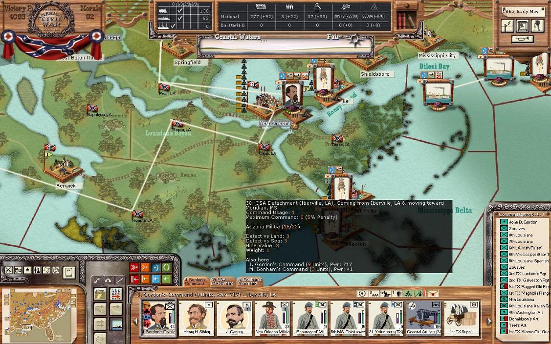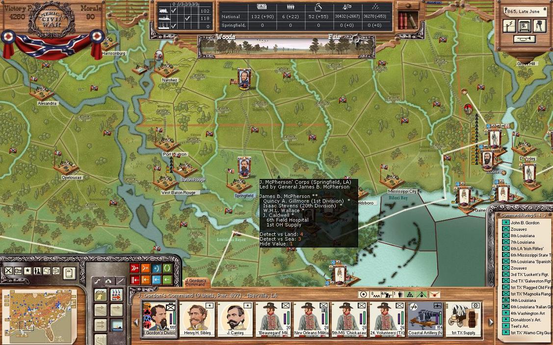 Louisiana/Mississippi – I will discuss these two states together because they are really a single department. Last turn, Jackson/Vicksburg was threatened by 2 Union full divisions plus 2 weak Union divisions. There wasn’t an attempted attack on Jackson or Vicksburg, instead, the Union forces split and headed south towards New Orleans. And, this is why it is important that NO has a division. McPherson’s corps made it to Springfield, while Lyon’s division seem tired and slow and only went to Pike MS. In New Orleans, there is a very strong division led by General Gordon. There are about 10,000 men dug in around New Orleans with level 8 trenches. Furthermore, the land is a swamp which would limit the Union’s greater numbers. It’s hard to say what the Union will do now. Now that it sees there is a division there, I would be surprised if they would attack. Baton Rouge is nearby and has 93 GS, it may go there, but 93 GS isn’t a lot when you are dealing with several divisions that need to be fed. Both Union forces are on yellow supply levels, so they haven’t taken supply hits yet. What I’m doing to reinforce NO is send a general from Galveston, mentioned earlier, and a battery and infantry regiment from Mobile. Both the general and forces will arrive in 18 days. The Union fleet on the Mississippi entered Joseph Run and took 43 hits. This is the opportunity I’ve been looking for. My fleet will leave Vicksburg and enter Joseph Run on attack. Meanwhile, up in the north of MS, Foster’s corps have taken over Corinth. However, Bee’s corps has now combined with Forest’s cavalry division in Tuscumbia AL. This force will now target Foster’s corps. As this force will arrive in 2 days, I think that is has a very good chance of catching Foster out in the open, and perhaps capturing the lot. Foster’s corps is on red supply, so I’m guessing they have taken some supply hits. Furthermore, they are only 1 division and aren’t dug in. I had a cavalry regiment take back Grenada and Bolivar. This turn it will try to take back Helena AR. I don’t want the Union to get any free supply from un-garrisoned towns.