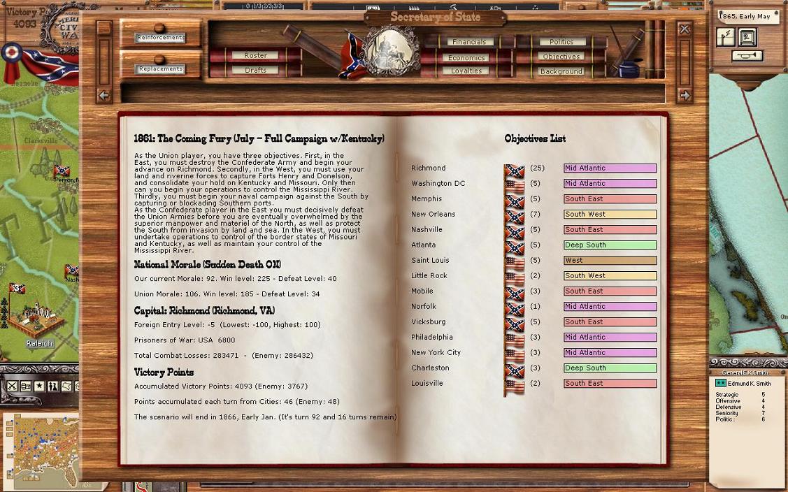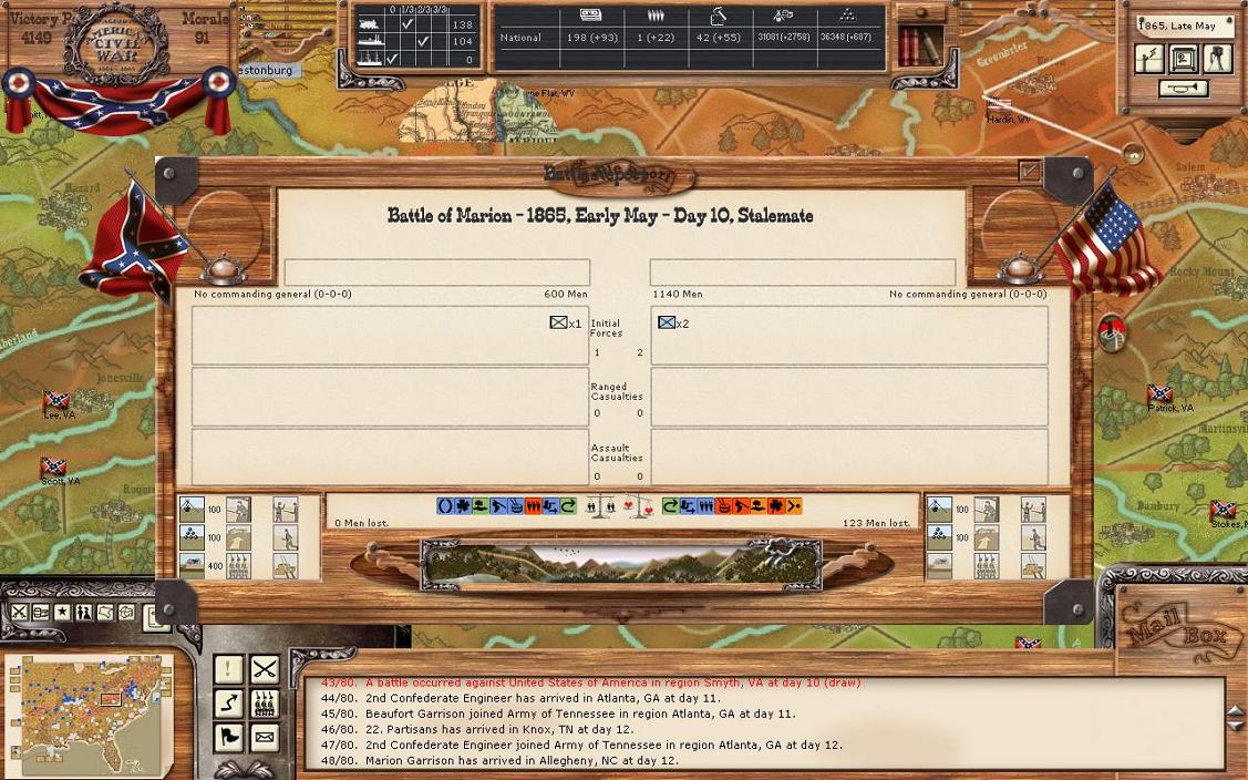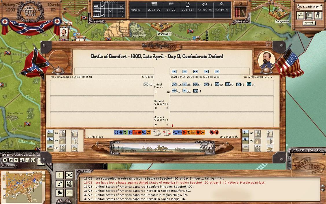 A fun read! I'm hoping you can somehow come up with a crushing victory in Virginia. . .maybe the Union will blindly attack you at Richmond and just run right into your defenses (wouldn't that be nice).