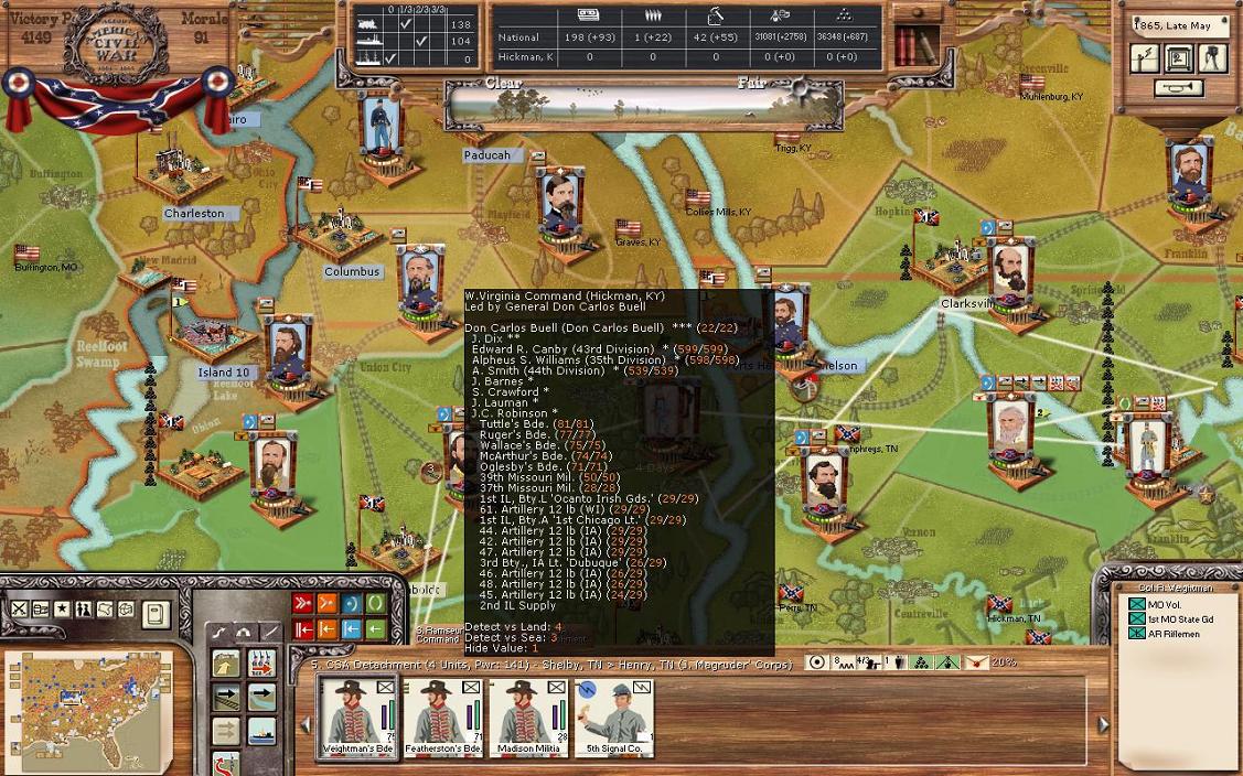 The big Union move is that Buell has formed a rather large army in Columbus KY. This Union army has power of 2,429. That is a significant enough of a threat for me to change some of my formations to strengthen that part of the line. Here is what the CSA will do. 3,300 men and 7 cannon from Memphis will go to Magruder’s corps in Henry TN. 2,300 men and 7 cannon will go to AP Hill’s corps in Humboldt TN. 1,400 men and 7 cannon will go to Magruder’s corps from Polk’s corps in Nashville. This will give AP Hills corps power of 950 and Magruder’s corps power of 800. Both of these positions are already on level 8 trenches with both commander having defence values of 4. The Memphis defences will have 10,000 men and 49 cannon.