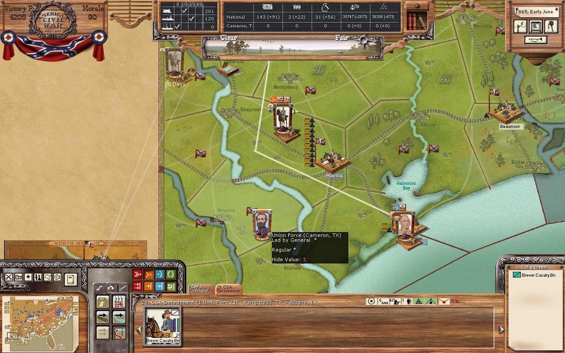 A CSA cavalry regiment from Houston made it Laredo and took control of the town for the CSA. The regiment is now on the way back to Houston. I’m sending 1 general from Galveston to New Orleans to up the command structure there. 1 general will leave Dallas and go to Galveston to replace the one that is off to New Orleans.