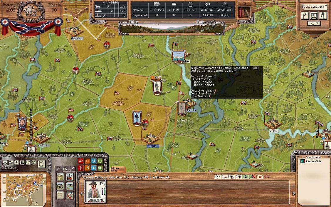 There was no action in Louisiana, but some in Mississippi. I took Corinth back from the Union with a cavalry unit. Another Union force in Oxford MS destroyed the RR and went south to Holmes. It has a hide value of 3, and I’m not sure what it is, maybe a large cavalry Union force? It makes me nervous though. McPherson’s corps took the militia held Meridian and captured the lot. That union force has 16,000 men and power of 1,000. I’m going to make a few moves. My cavalry regiment in Corinth will rebuild the RR. Cleburne’s Division will go 1 region south to Oxford MS hoping to get a better look at the Union force in Holmes. Kershall will hold Marshal 1 more turn until it can ride the RR to Corinth, Watie’s division will hold Grenada. 1 cavalry regiment will leave Grenada 1 region south to Carroll to get rid of the Union cavalry there or rebuild the RR next turn. Pender’s division will leave Grenada to take up a defensive position in Canton MS (NE of Jackson). This allows me to guard against a small river and blocks protects Jackson. The Union captured a depot in Meridian, so that is a big negative, maybe I should have seen that coming and blown the depot. This means the Union divisions will resupply there. My biggest concern at this point is Mobile AL. Rhodes arrives but I can’t form a division with him this turn. The current power is only 191, but 4 more regiments are on the way as well as 3 other generals to reduce the CP. There is only 8 cannon there though so I'm building a 12 pound battery in AL this turn and I hope I get lucky with the build! There are 2 regions between Meridian and Mobile, both of which have mud. Mobile is also a marsh. Could McPherson make it all the way to Mobile? I certainly hope not because I think Rhodes would lose the battle and I have no way to send additional forces there this turn that would arrive on time. One final note, the Union’s Army of TN in Bolivar MS is on yellow supply already, indicating supply problems there.