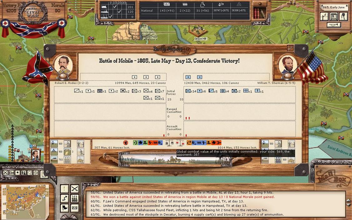 Longshanks wrote:Barring the sudden fall of Richmond, I'd have to agree that you are entitle to, at the very least, a "moral" victory. Owning as much as you do - for example essentially all of Tennessee, Georgia, and the Carolinas, it seems to be that the Draft Riots in the North and the inability of the Union to "finish the job" would have caused an end to the war, although certainly the reelection of Lincoln in 64 might have made that impossible.