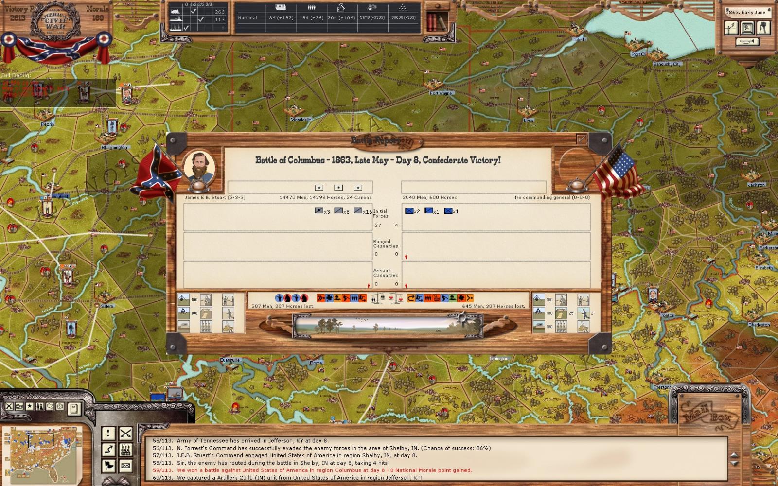 Stuart and Forrest were both successful at their objectives. J.J. will continue to attack the forces at Louisville to keep them weak. I think Stuart and Forrest can tie up any reinforcements he sends to the area.