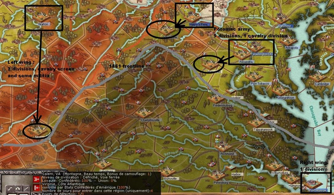 In Virginia, it's time to deploy the Potomac Army. All around Mannassas, Federal troops'll take positions. I keep divisional organization and avoid command penalities to grew up my chance to keep my defensive line.