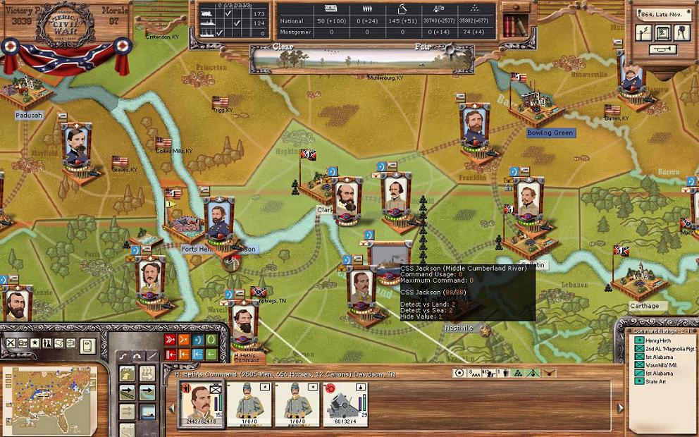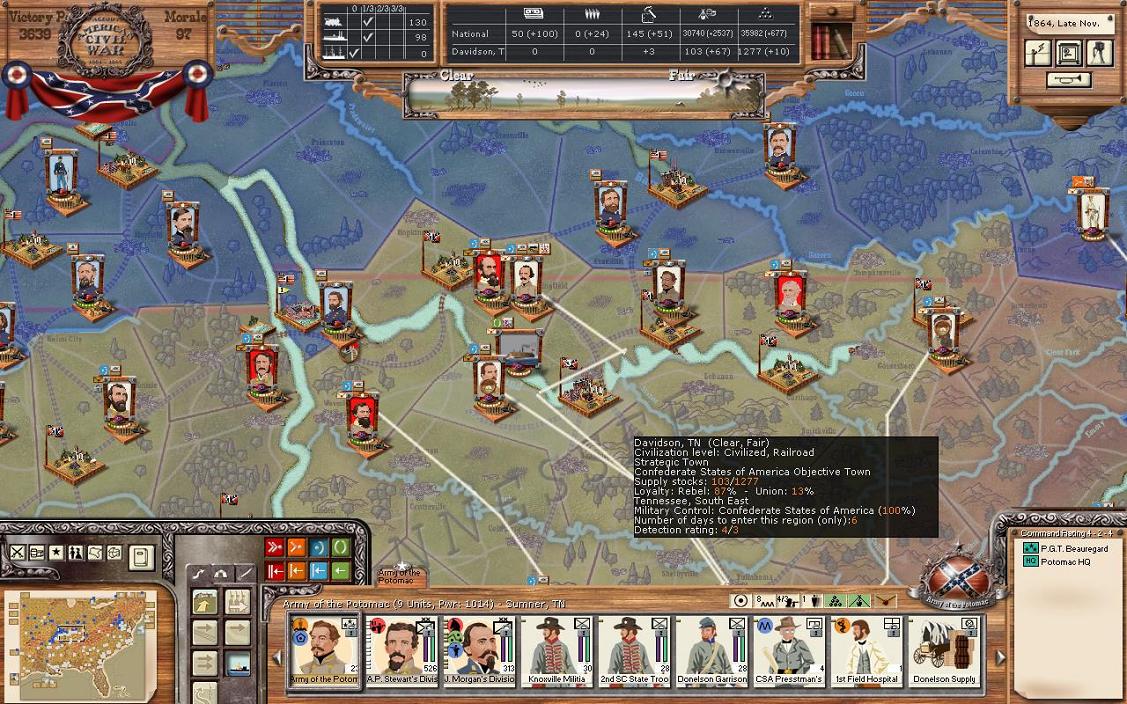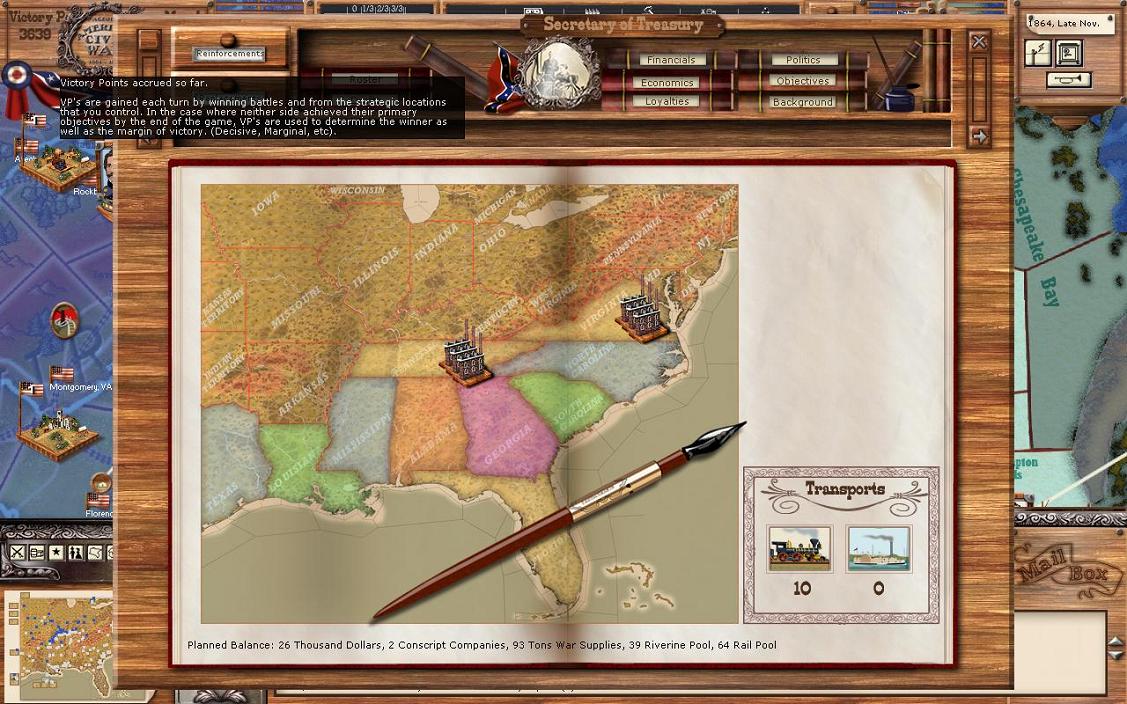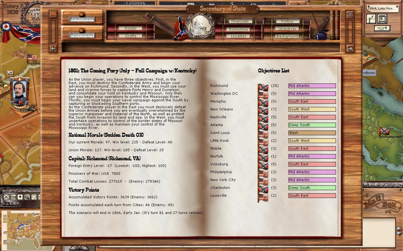 If you now look to your right, you will see the Objectives list. The list shows the names of the cities, the flag (who currently controls the objective), a number in parentheses (I believe this is the NM hit you take or gain by taking the objective. Can someone confirm this?), and the region they are in. A player doesn't pay attention to his or her objectives at their peril. Objectives generally are strategic locations, provide conscripts, WS, $, or are a key harbour. Losing them really hurts your war effort. The CSA has 9 objectives and the Union 6. However, the Union controls St. Louis, Little Rock, and Louisville. That should tell you that the CSA has not made head way or been able to hold MO, Arkansas, and Kentucky. All the objectives are reasonable except for New York City. I've never understood why it was there. The CSA taking New York City is beyond the realm of possibility in history, and should be in this game too. Baltimore MD or Harrisonburg PA would be more realistic objectives.