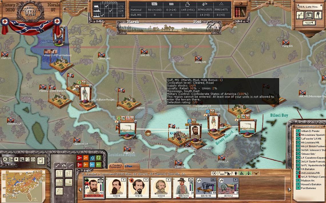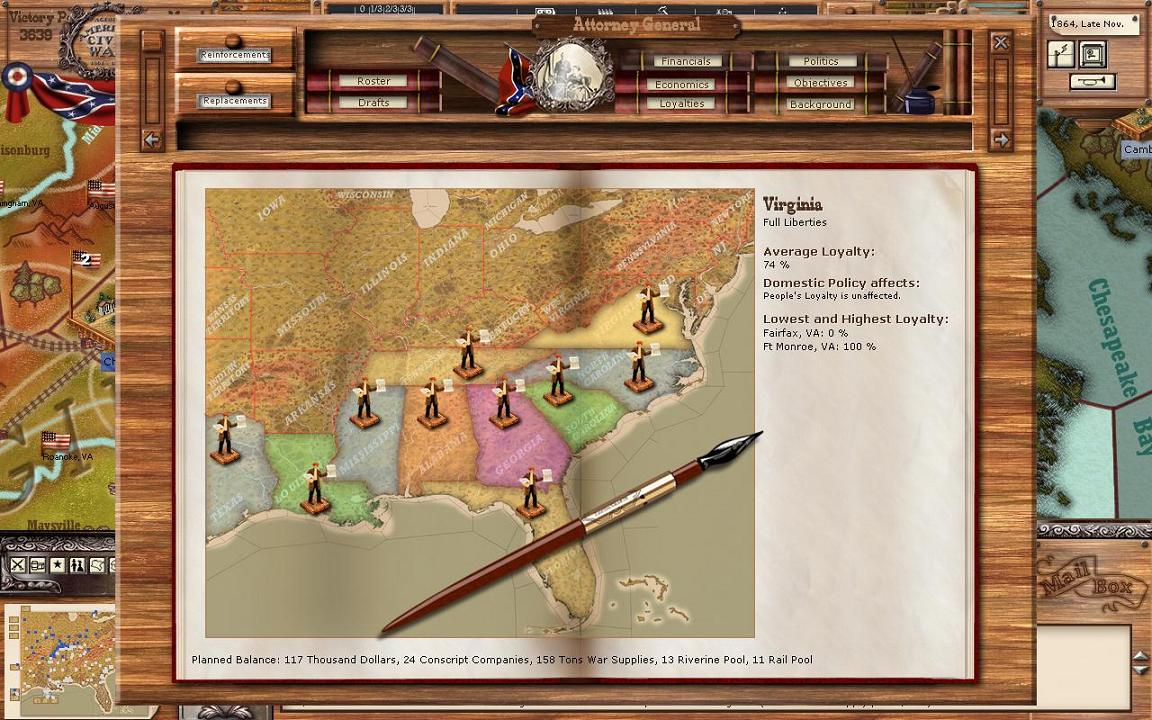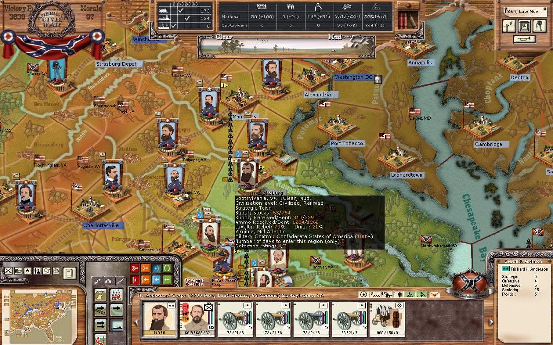 Loyalty is very important in the game. Basically, the higher the loyalty of a town, the more they will produce. Towns with low loyalty that you control that aren’t garrisoned can have partisans appear. Furthermore, if the loyalty is low partisans can appear. Loyalty also gives you detection bonuses. If region is especially hostile (loyalty less than 10%) and it isn’t garrisoned, an enemy unit will take over the region. Searching loyalty in the manual will give you some more specific %s. In my case here, you will see I have full liberty for all of my states. You will also notice a couple other points; I can’t change Arkansas, MO, and Kentucky. This is because I don’t control the state. Finally, take a look at the right of the picture, it gives details on VA. Fairfax gives me 0% as it has been under Union control the entire game. Basically, the people there never expect to see the CSA again. Ft. Monroe on the other hand is 100%.