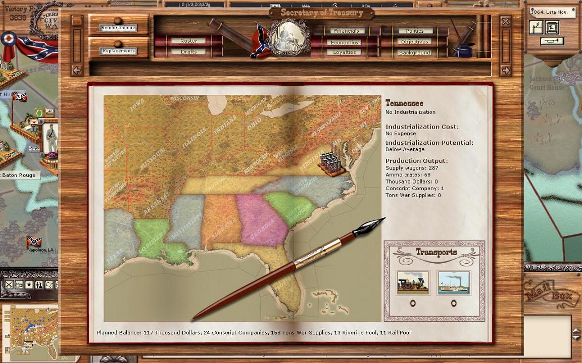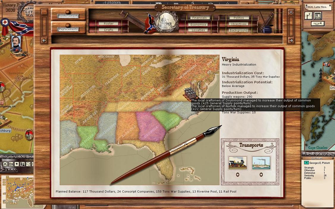First of all look to the right and you will see some details on Tennessee. You will note that in the top right it says “no industrialisation”. This means that I’m not investing any money in TN. Right below you will see that the industrialisation cost is zero, which makes sense. The next section tells us the production output for TN. Supply wagons 287, ammo crates 68, thousand dollars 0, conscript companies 1, tons war supplies 8. You will also notice by looking at the map that I have heavy industrialisation for VA. More on this later, but as a hint, it is to keep my Army of Northern Virginia from starving.