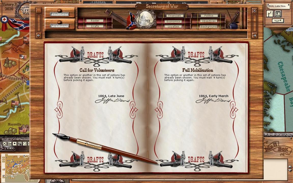 F4 - Secretary of War is where you choose extra ways to get conscripts. The CSA gets conscripts in 3 ways. First is regularly through cities. Second is through calling for volunteers. Third is through mobilisation. Each one represents a different historical method.