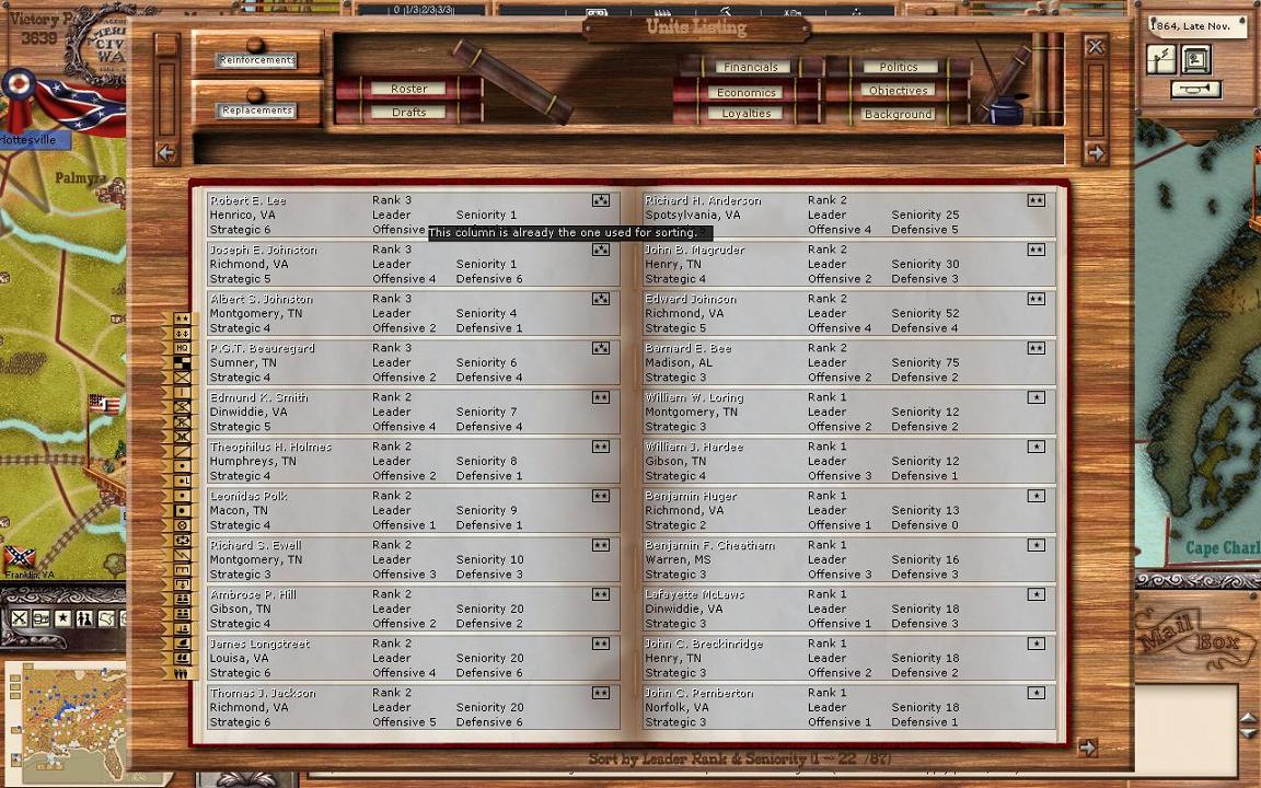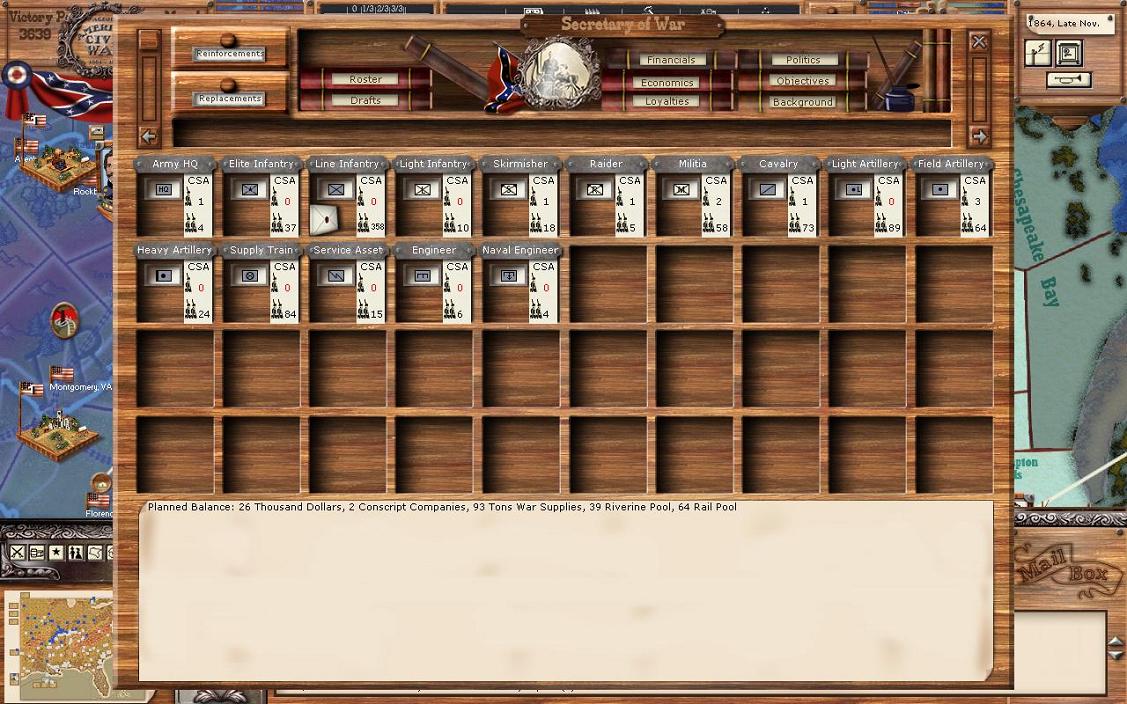 Move capital: Moving the capital is an option in the game just as it was in real history. Historically, the capital was moved from Montgomery to Richmond early on in the conflict in 1861. It was never moved again though. That isn't to say it shouldn't have been moved from Richmond in 1864, but the CSA didn't, according to Jeff Sharra's novels because of Davis' insistence that Richmond be held at all costs, which led to the siege of Petersburg and the rest is history. Now, by clicking on the paragraph below move capital it will scroll through options on where you can move the capital. Currently for me these are Memphis, New Orleans, and Atlanta. As I mentioned earlier, I've chosen to not move the capital in this game no matter what.