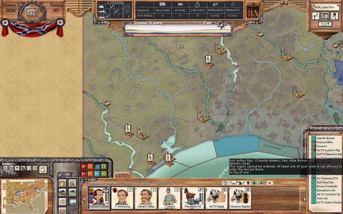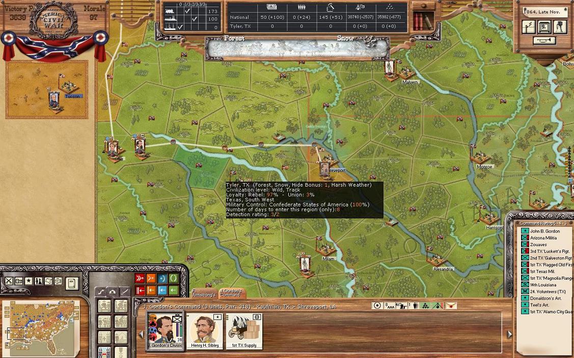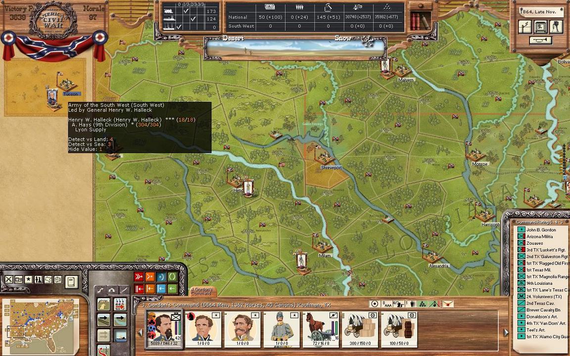 In Texas, I’m splitting the Gordon division into 2 divisions, with Armstrong now commanding a brigade sized division in Dallas and Gordon going with the majority of the division to Shreveport. I want to be closer to what Lyon’s force in Louisiana is up to. I thought about sending Gordon to try to take back Ft. Smith in Arkansas but with winter fast approaching, I was worried of getting stuck and starving. Finally, the cavalry unit in the IT will head south to join Armstrong.