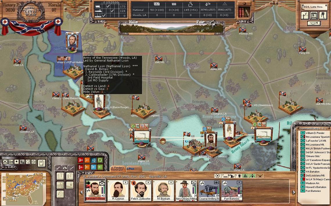 In Louisiana, the small New Orleans fleet is going to the Baton Rouge shore to stop any river movement south from Lyon’s force. I really should have done this one turn earlier. Now, Lyon can take Baton Rouge, which is a level 3 city with a conscription point, and there is nothing I can do to stop him.