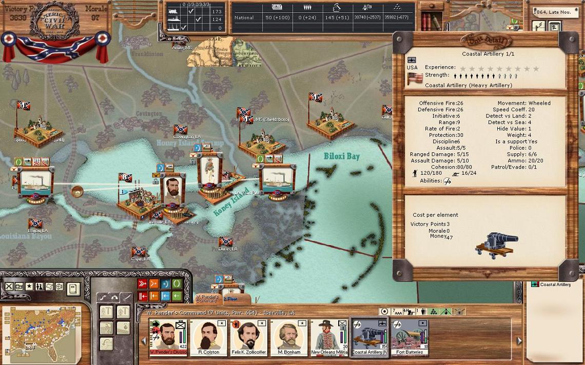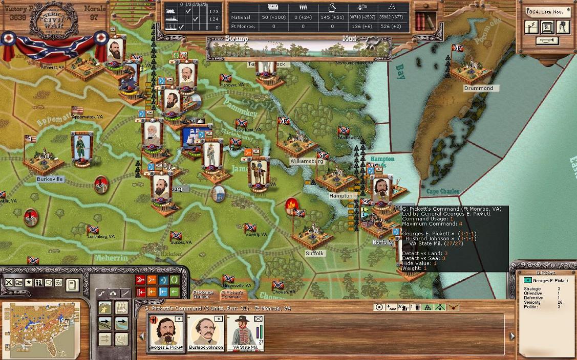 The final 2 forces in Virginia are Norfolk and Ft. Monroe. General McCowan’s command of 2780 / 528 / 21 commands the forces inside Ft. Norfolk with the coastal artillery. General Pemberton has a sole militia unit outside the outside the fort. Norfolk produces 78 a turn in supply, a decent amount. General Picket commands a sole militia unit in the defences of Ft. Monroe. I really would like a division here as well as in Norfolk, but as I’ve been pushed all the way to the gates of Richmond, Richmond has taken a higher priority. Surprisingly, the Union hasn’t tried a sea invasion to take Ft. Monroe back. Perhaps something to come in the future…..