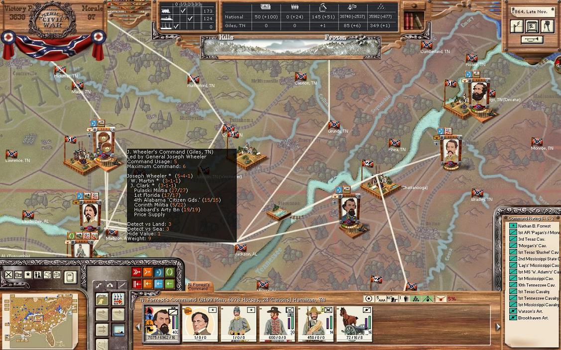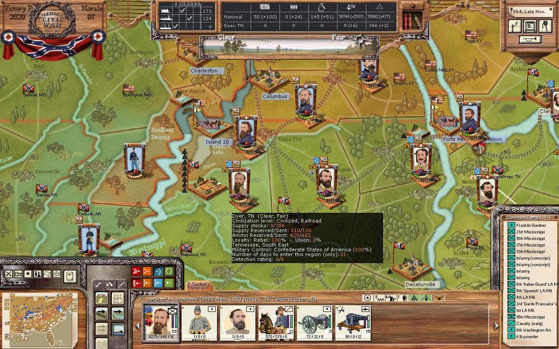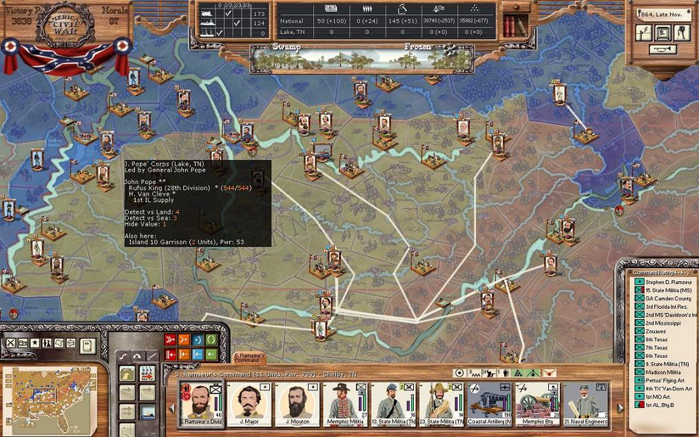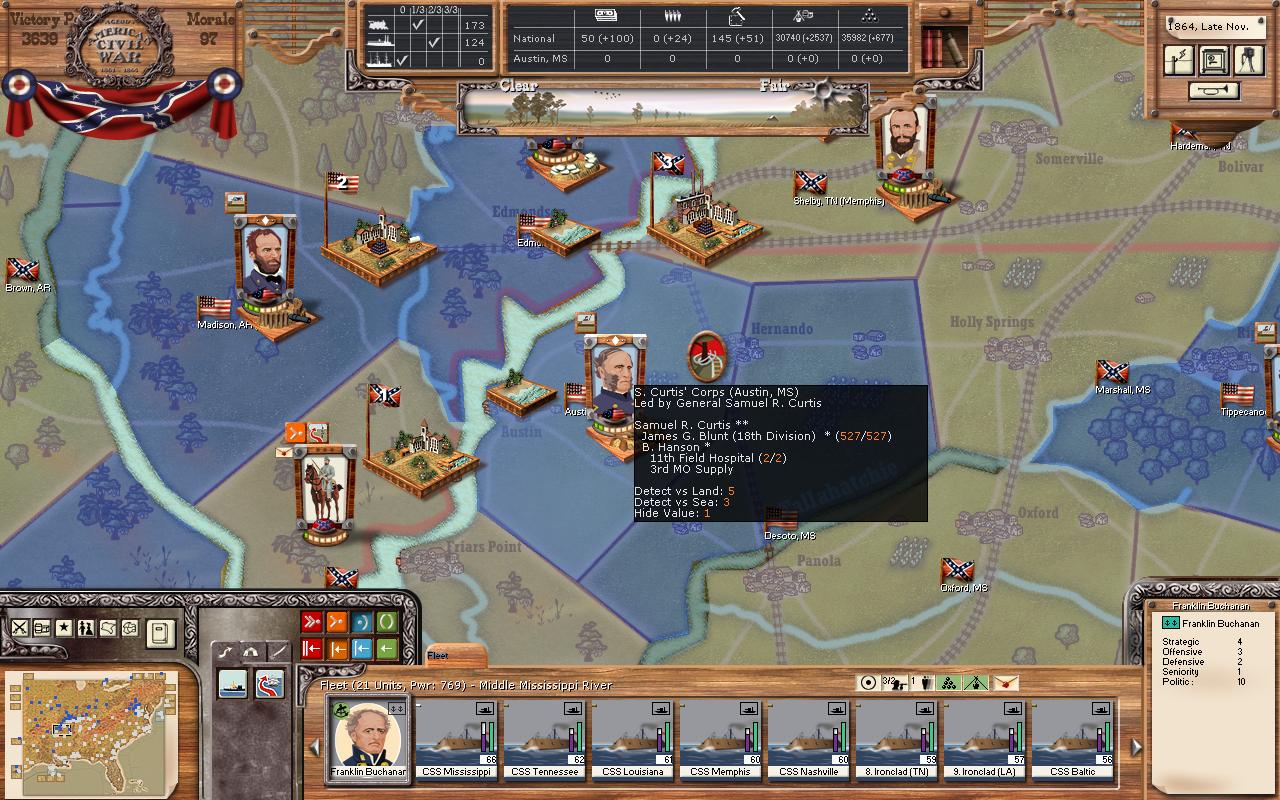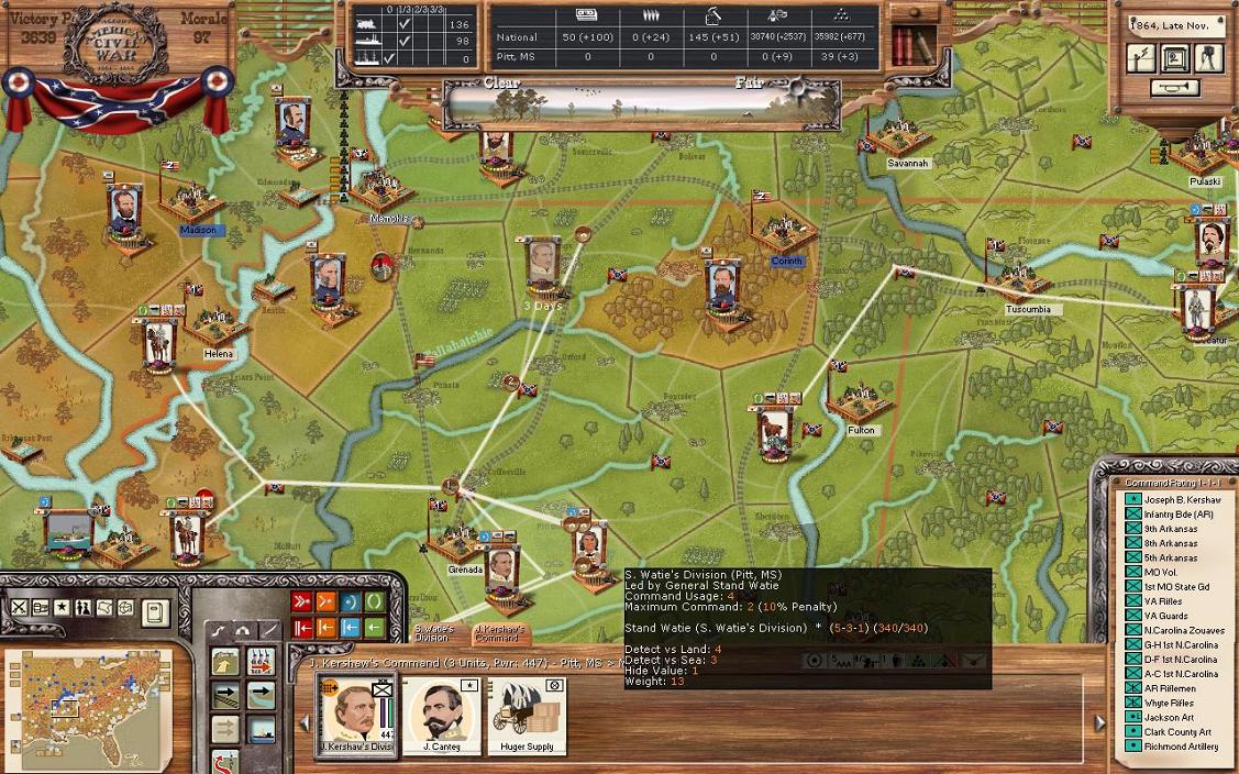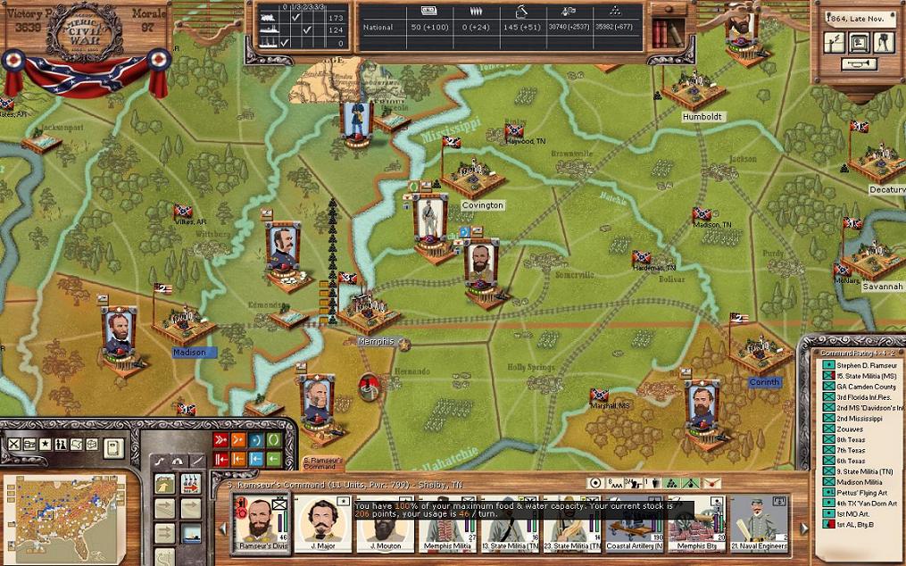 In Mississippi, the newly formed Kershaw’s Division will take the trains to set up a new position just west of Corinth in Marshal Mississippi. Memphis is directly to the northwest. This is part of my attempt to keep the rail line open from Mississippi to Corinth. An engineer unit from Vicksburg will also travel there to help quickly dig in. The two cavalry units in Helena and Bolivar will head to Grenada to join Watie’s division.