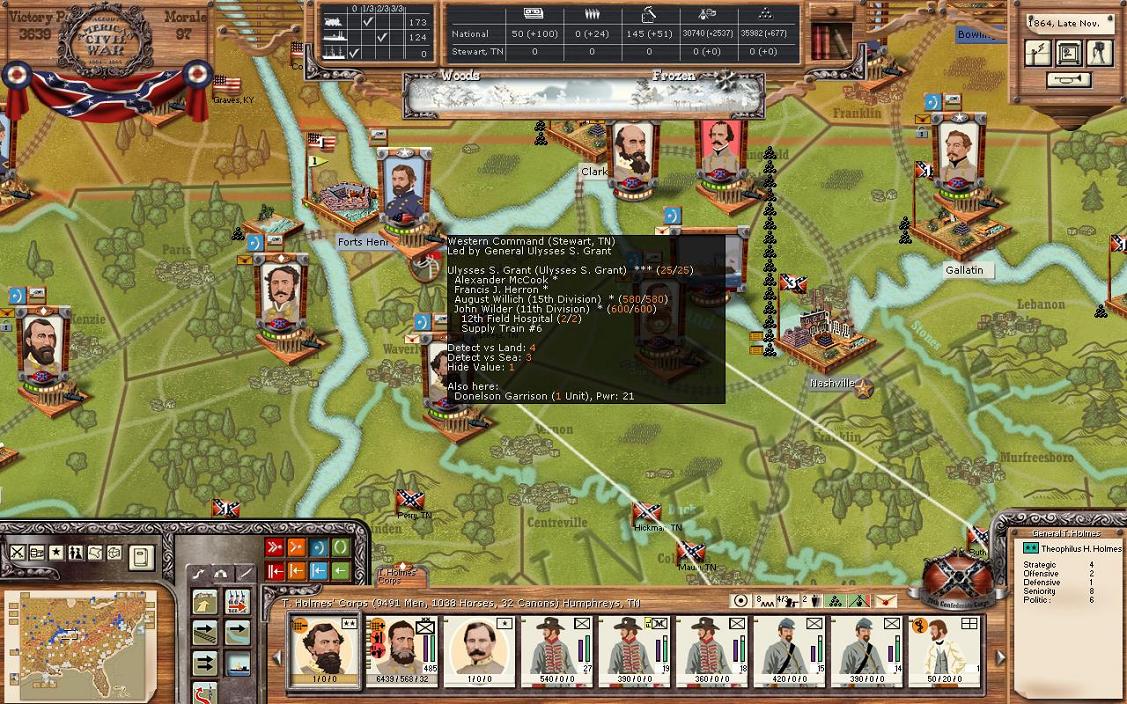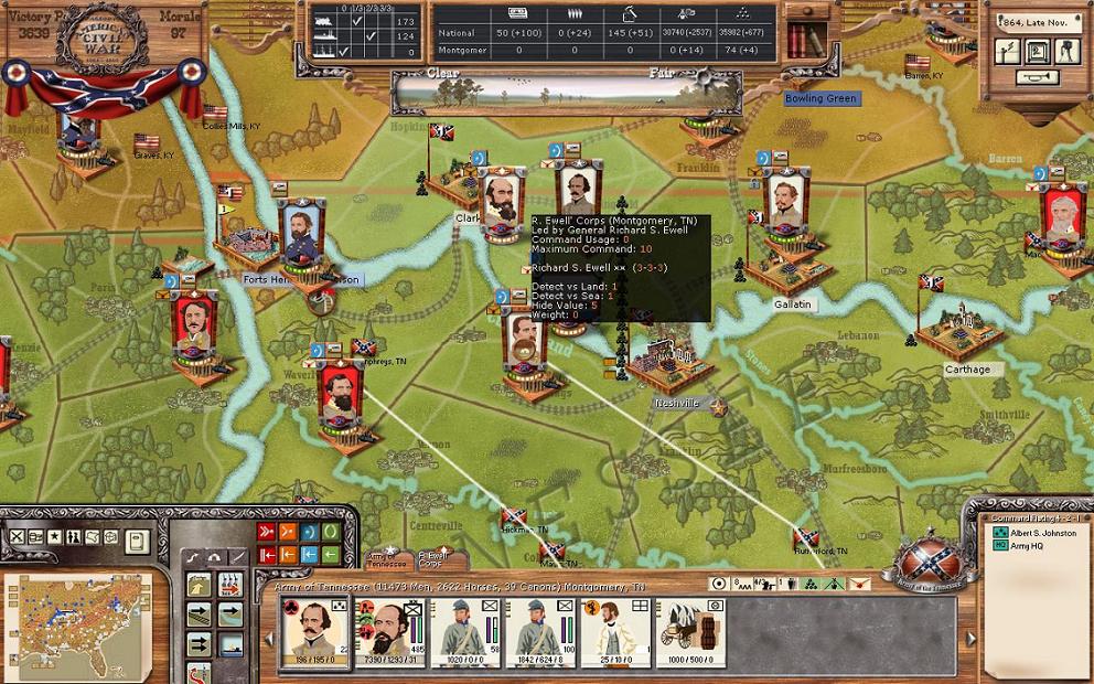 In Tennessee, there is a new commanding general. General Beauregard is now commanding the corps instead of A.S. Johnston. Johnston will head to Charlestown SC. I was finally able to do this as I created a new army of Joe Johnston who now commands an empty army in Richmond. Once Joe Johnston’s Army is ready to move, I’ll send him to TN to take over command from Beauregard as Joe Johnston’s stats are better than Beauregard’s 4 / 2 /4. Other than this, I’m making no moves in TN.