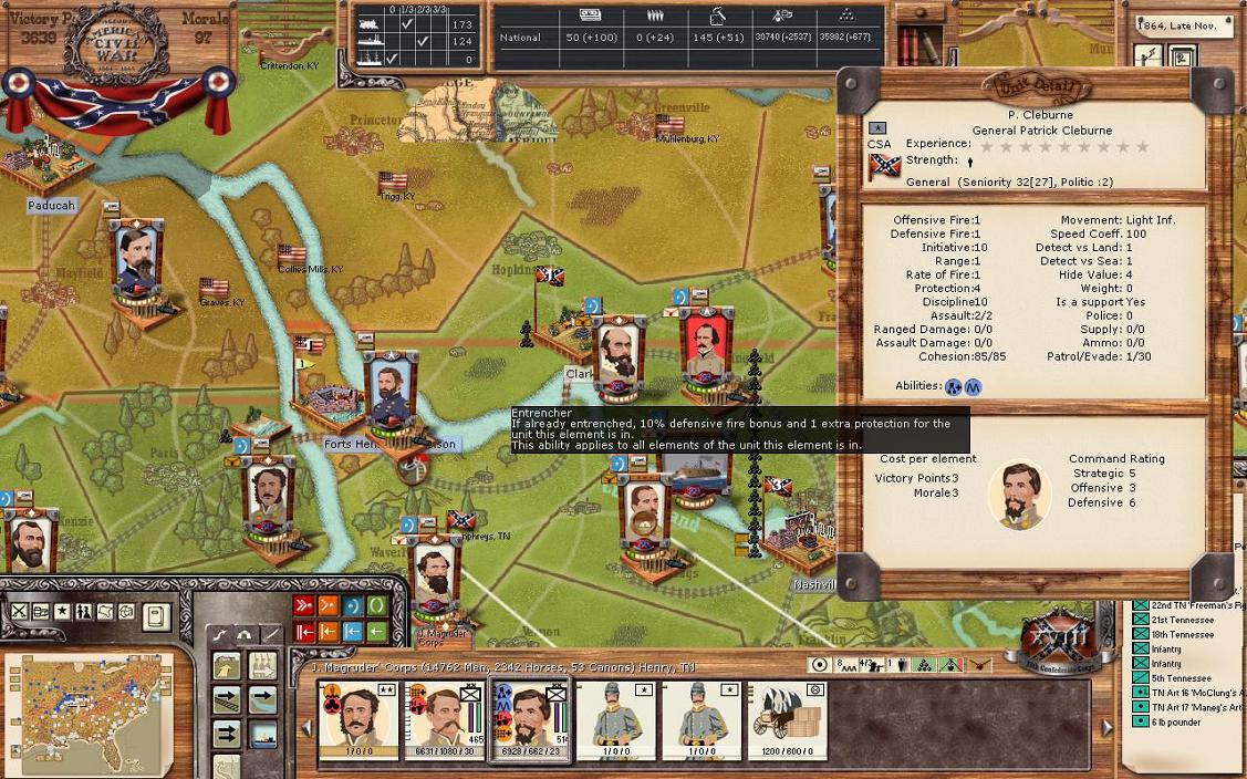The next section down is National Morale (NM). NM is one of the most important aspects of your ability to wage war. NM impacts the power of your forces and your production values. There are 'sets' where it changes, of which I don't know where they are exactly as I'm not such a big formula person. Having said that, CSA NM is 97 and Union NM is 127. That is a substantial edge. However, 97 is nearly par and I can hold forces still for a number of reasons (high trench values of 7 and 8 being one of them).