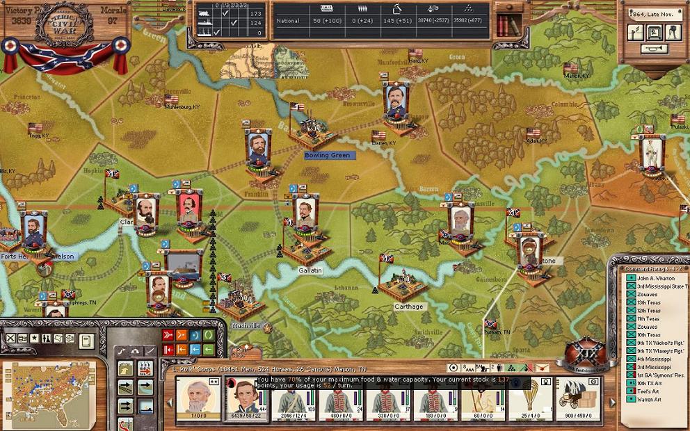 Now, look at the bottom right and you will see a Transport section. This is where you can buy additional railroad and river transport stock. Two issues here, as far as I’m aware, the CSA produces a small amount of railroad and river stock each turn, however, to buy more you simply click on the train or boat. RR is bought in increments of 10 and river in 5. RR and River stock is needed to move supplies and move troops. Some people play a house rule where you can only move troops on the river in an actual fleet. This is more realistic, but for our game we’ve been playing the game without this rule.