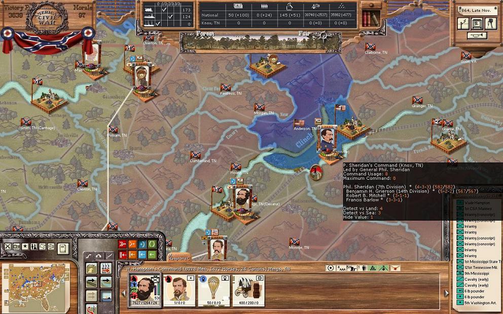 The ever great Robert E Lee, commanding general of the Army of Northern Virginia, is just south of Richmond in Henrico with 9840 / 1420 / 102 with Stevenon’s division. What to say? It’s a small force, but again has the benefit of MTSG from Richmond and a small force to the south. The force protects the line to Petersburg and now forces the union to go all the way south of Petersburg if they want to get around it, which isn’t that easy to do now that it is winter. All of the CSA forces here are in desperate needs of supplies and the supply system is barely able to meet the needs. I’ve contemplated rebuilding a depot in northern NC to push supply forward. I know there is excess supply in the south as Wilmington has a nearly fully stack of supply waiting for the AoNV.