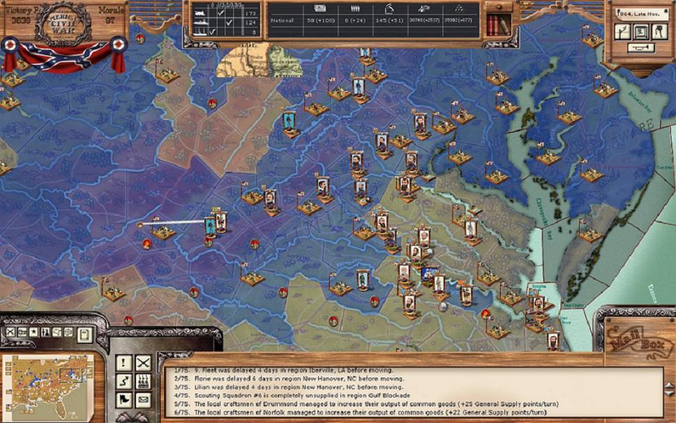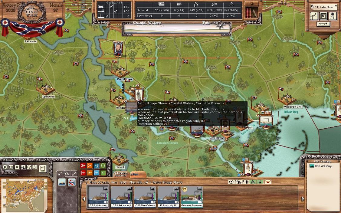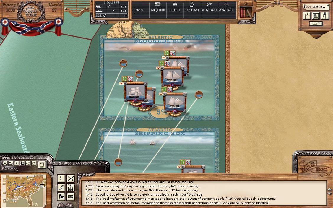 Blockade running played a major role in bring in war and general supplies for the CSA. As the CSA player in this game, we have a distinct advantage to know to build blockade runner early on, while in history the CSA waited a year before ramping up this programme.