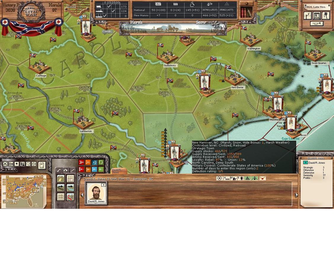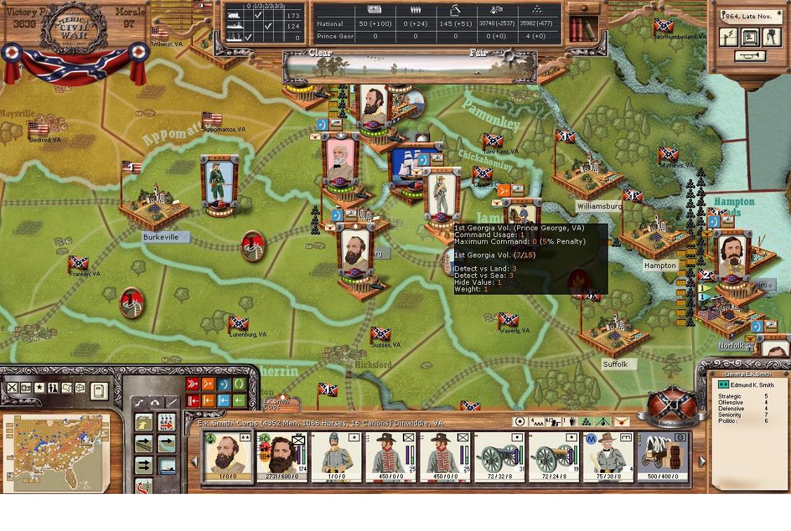Edmund K Smith’s Corps 4952 / 1086 / 16 with McLaw’s division holds the southern end of the line of Petersburg with this tiny force. Yes, this force is so small it makes me nervous. However, With it being winter, and there isn’t a RR to bring a large force to near Petersburg or already a large force positioned, I feel rather confident it can hold before going back up to full strength. The Petersburg depot was blown a while back by the Union when an aggrieve division sized plus cavalry operation captured the city. This combined with me having to blow the depots in NC to starve out a Union expedition there has effectively meant that my north south RR supply route isn’t working, even though I control all the regions and the RRs are fixed. I’ve been aware of this, so I’ve been industrializing in Virginia and wondering about building a depot in northern NC, although I’m not sure I have the forces to defend; otherwise the Union will capture and destroy it again. Just to the right Smith’s Corps is a Militia Unit and Raider unit building some fortifications along the James River.