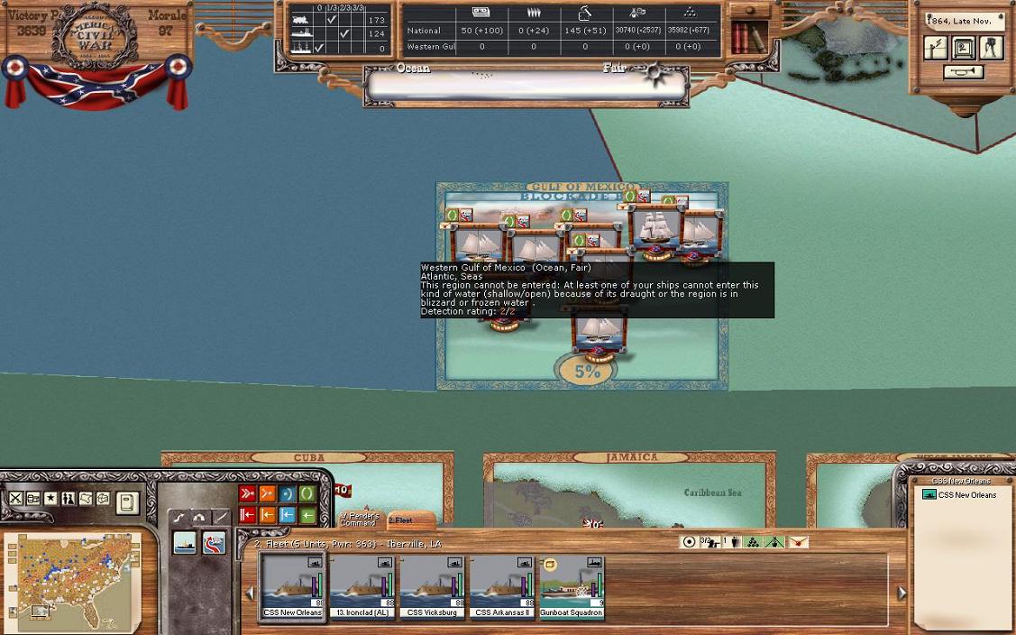 The Union has focussed most of the ant-blockade running fleet in the Atlantic, and sunk about have my brigs there. I haven’t seen the Union much in the Gulf of Mexico, and currently there is no port in the Gulf for ships to resupply, so it would be very practical for a Union fleet to hang out down there.