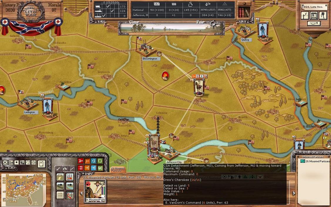 Starting in the fat west, my orders for Missouri are to have my partisan unit tear up the tracks, head through Bloomington before going to Jefferson City. One Indian unit will leave Jefferson City to go to Vienna to tear up the tracks next turn. The Union hasn’t made a big push to get rid of my small force in Missouri.