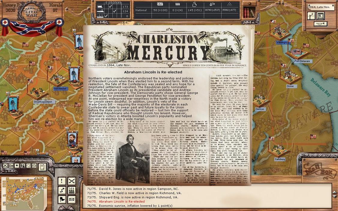 We are finally ready to continue with game! The big event from the previous turn was the Lincoln was re-elected. Does anyone know if Lincoln is always re-elected?