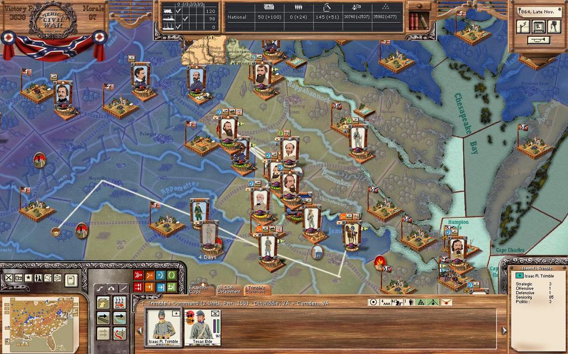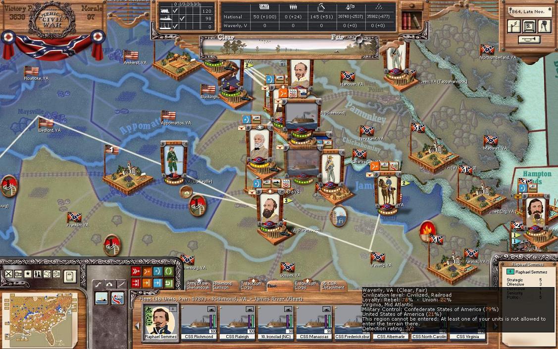 In Virginia, I’ve decided upon a few movements. A cavalry unit will try to take over Covington and a raider unit will go for Lynchburg. I’m taking part of E.K. Smith’s Corps to attack the sharpshooter unit in Burkeville; Trimble will lead the Texans in this. Finally, and the big one, I’ve decided to send the fleet out of Richmond. I’m nervous just thinking about it, but the Union fleet is low on cohesion and my fleet is in perfect order now. This will be a probing attack.