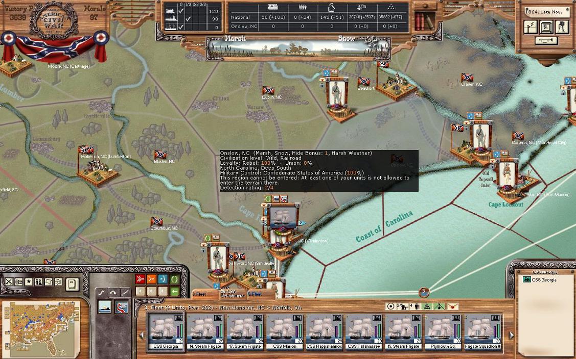 On to North Carolina! I control the state, but I said earlier, I destroyed the Raleigh and Garysburg depots due to a Union invasion of the state. You will see that I have a fleet based in Wilmington. My great idea was to build a fleet and send it to the shipping lane to sink the union ships in a battle. However, actually there are no “battles” in the shipping lane in the traditional game sense. We each gave each other some hits, and then I went back to Wilmington. It was clearly disappointing. I’m not really sure what to do with these ships now, perhaps have them link up with the Virginia fleet if that is ever out of Richmond again.