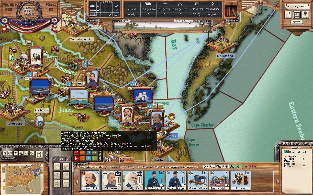 * tu as très bien fait de renforcer Fort Monroe, sa prise par le Confédéré rend toute menace navale de Richmond très compliquée. Cependant, je pense que tu as mis une division qui serait plus utile ailleurs, avec MacDowell par exemple. Personnellement, compte tenu de la date, de la solidité des fortifications et des 3 étoiles de Butler, je mettrai plutôt 2 ou 3 grosse Brigades de l'Etat de New-York pour sécuriser cette position et j'utiliserai mes divisions ailleurs.