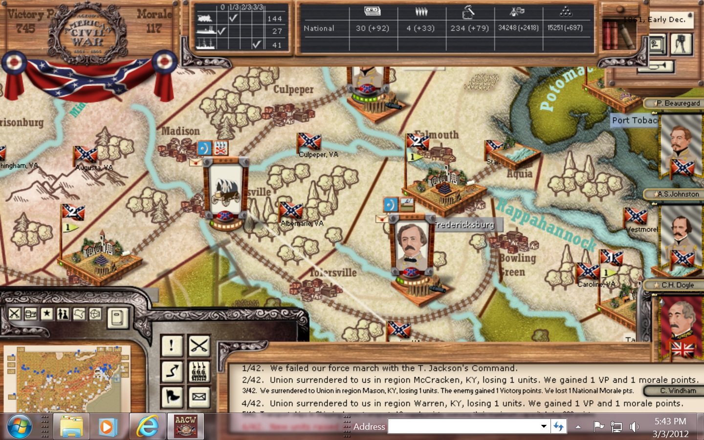 I posted this a while back but wasn't able to get a solution. My computer monitor is an ACER X191W LCD and supports resolutions up to 1440 x 900 @ 75Hz. I've not had problems with my monitor supporting AACW in the past. But when the 1.16 rc10 came out I uninstalled the game and did a fresh reinstall but when I boot up the game the ledger panel overlaps the "Quite, same game, replay buttons." Attached is an image of what I see.