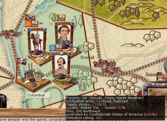 I have 100% control of Franklin, OH (containing Columbus). I only have 8% loyalty however. The 100% control allows me to move supply through Franklin to other areas (even with a low loyalty). The loyalty effects my ability to get production from this city. Also, if you look, there is a tent in the lower left of the city. This allows me to collect 1 CS point per turn as long as I have control. In the middle of the city is a supply depot (the brown square under the cannon balls). The cannon balls indicate that there is ammunition in the city (651 to be exact). Behind the cannon balls are small brown barrels indicating that there is general supply present (779 to be exact). How is this useful? Look at the attachment below. Marietta has ammo only, while Parkersburg only has general supply.