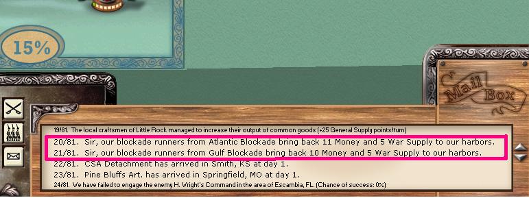 Here we have the wonderful Gulf of Mexico, pretty scenic this time of year I hear. But wait, what does my wondering eye spot, but scouting squadron # 2, sailing peacefully around. Note the green arrow. It points to the supplies on the ships (2 ships in the squadron). Right below is the ingame tip stating that I have 32 supply points, and that I use 2 per turn. This means that my ship can stay at sea for 16 turns before running out of supply. :w00t: Now look below, my ships have come in. :thumbsup: And what's this, they brought little Johnnie his musket (Huzzah!). Really it is money and WS. However, they only bring me gifts as long as they are in the blockade box (the game assumes they bring the loot in, and escapes them Yankees).
