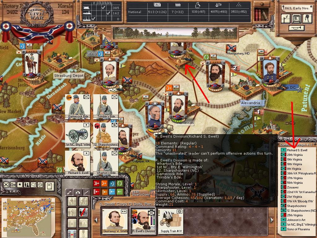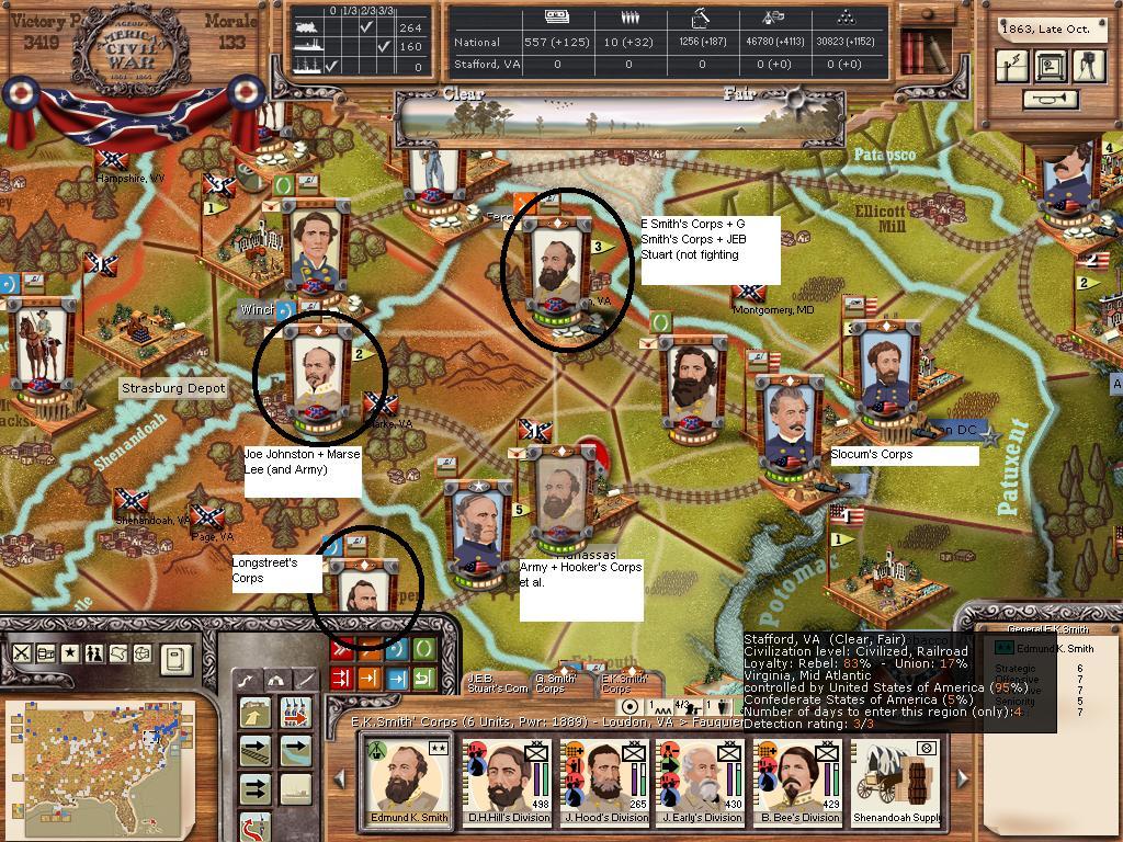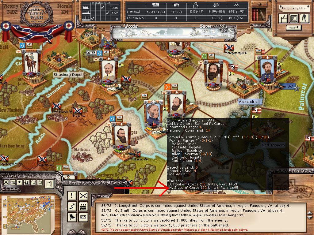Look below, and you see that Slocum has joined his fellows. He probably MTSG in support of the union army being stormed. How do I know this? Look at his new power level (it was 2100 before the storm, and now sits at 1695 (an almost 20% reduction). Hooker took a 20% reduction in power as well after the battle.