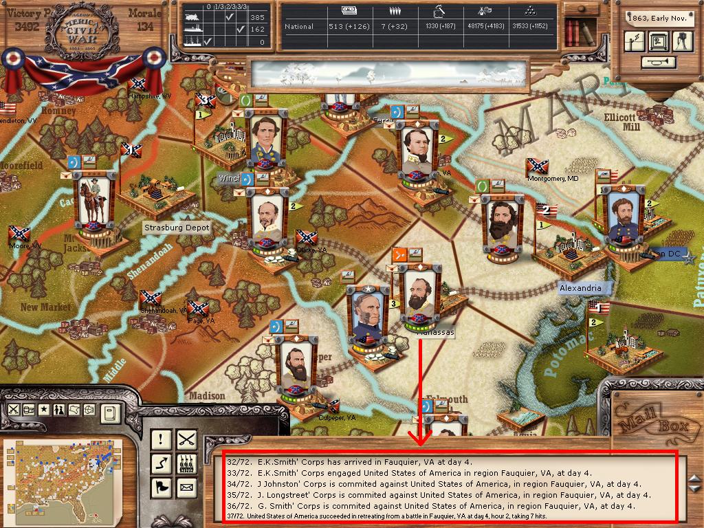 Here is the results of the next turn where I smashed the union army in Manassas. Note, that the troop levels are much higher for the union (as all units started in the area)