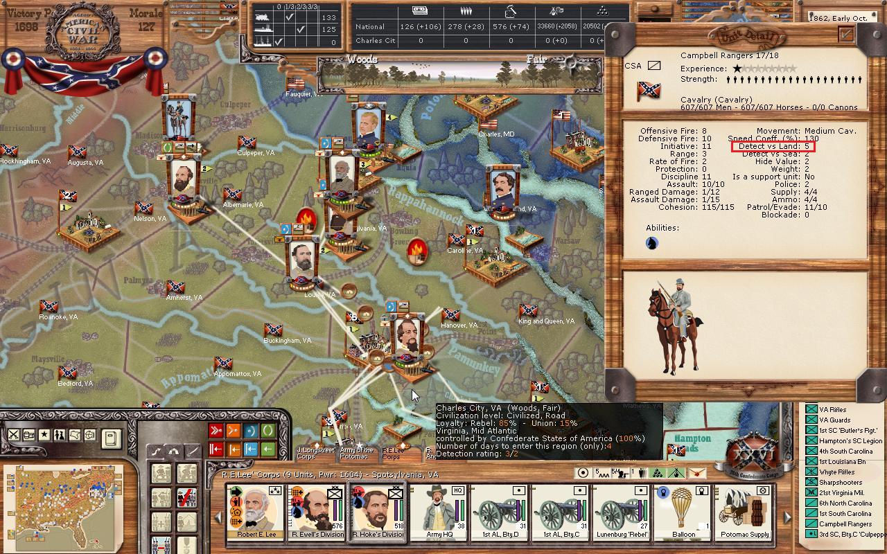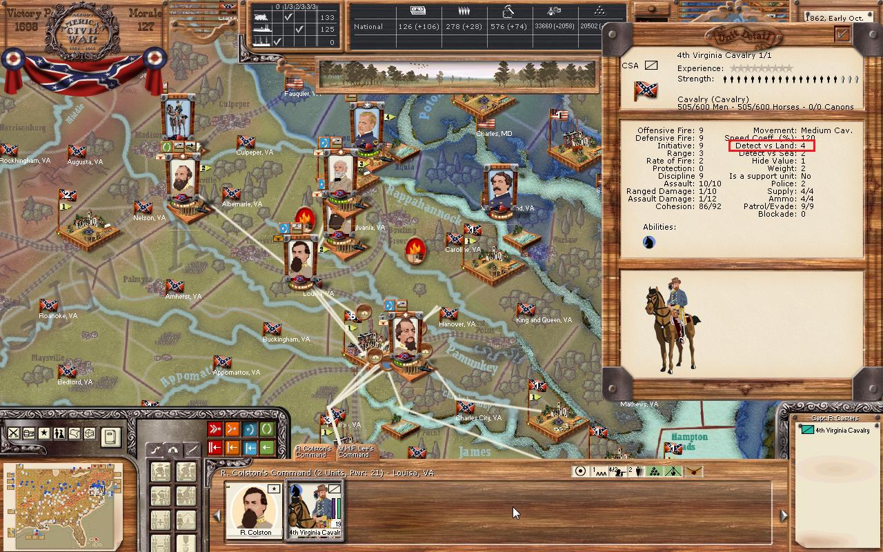 Well, the 4th Cav’s detection rating is good. It’s a four. But if you want the really extra juicy power numbers of the Yankees consistently, count on Campbell to bring home the soup and the bacon. He’s rated a five. Both are fine cavalry. One is just a bit more skilled at intelligence ops. And by the way. Extra experience doesn’t seem to change this trait. So more often isn't neccessarily better. So notice who you’re you’re sending to encircle the Yankee lines before you do it. You could be glad you did.