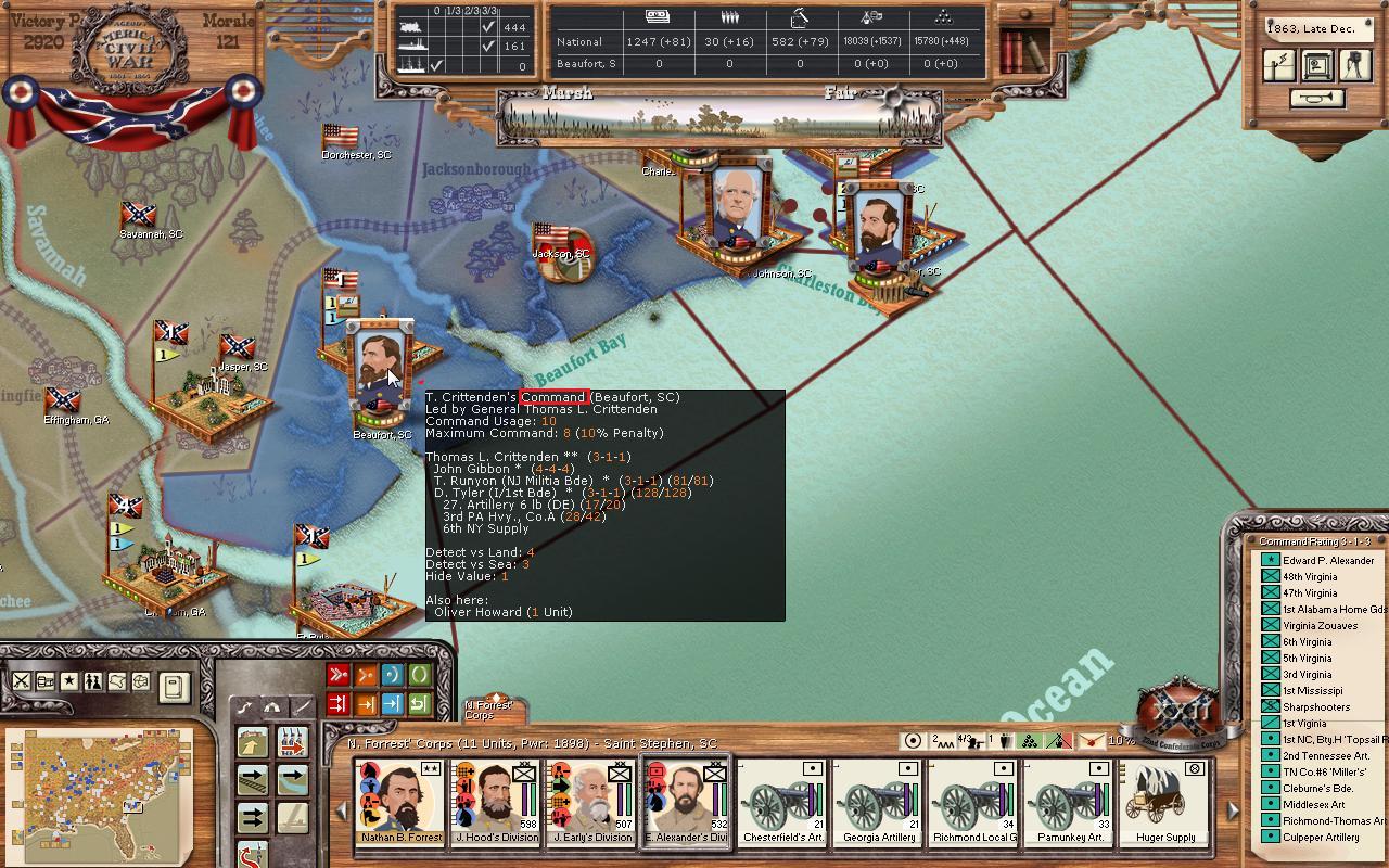 Borrowing Forrest's corps from Lee's Army of Northern Virginia, Albert Johnson's Army of the Deep South and various militia contingents in Georgia, Alabama and Louisiana, Johnston successfully put together an ad hoc force that is successfully forcing the Yankee back into the harbor. To do this it is effective to first gauge up the enemy force and its dispositions.