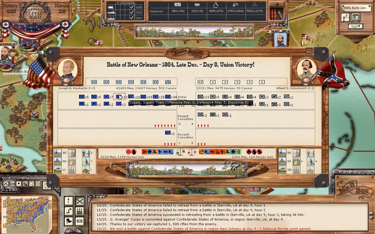 In this example the Hooker Express finally arrives at his last objective, New Orleans, late in 1864. In fact, Lincoln was just won the election. Notice all the starlit heavens: all the two star commanders on his side of the battle. He has arrived with four corps, eager to not take casualties. Intelligence at this point is not very important but the examples are still illustrative. And we'll talk about watching for general officers in a while.