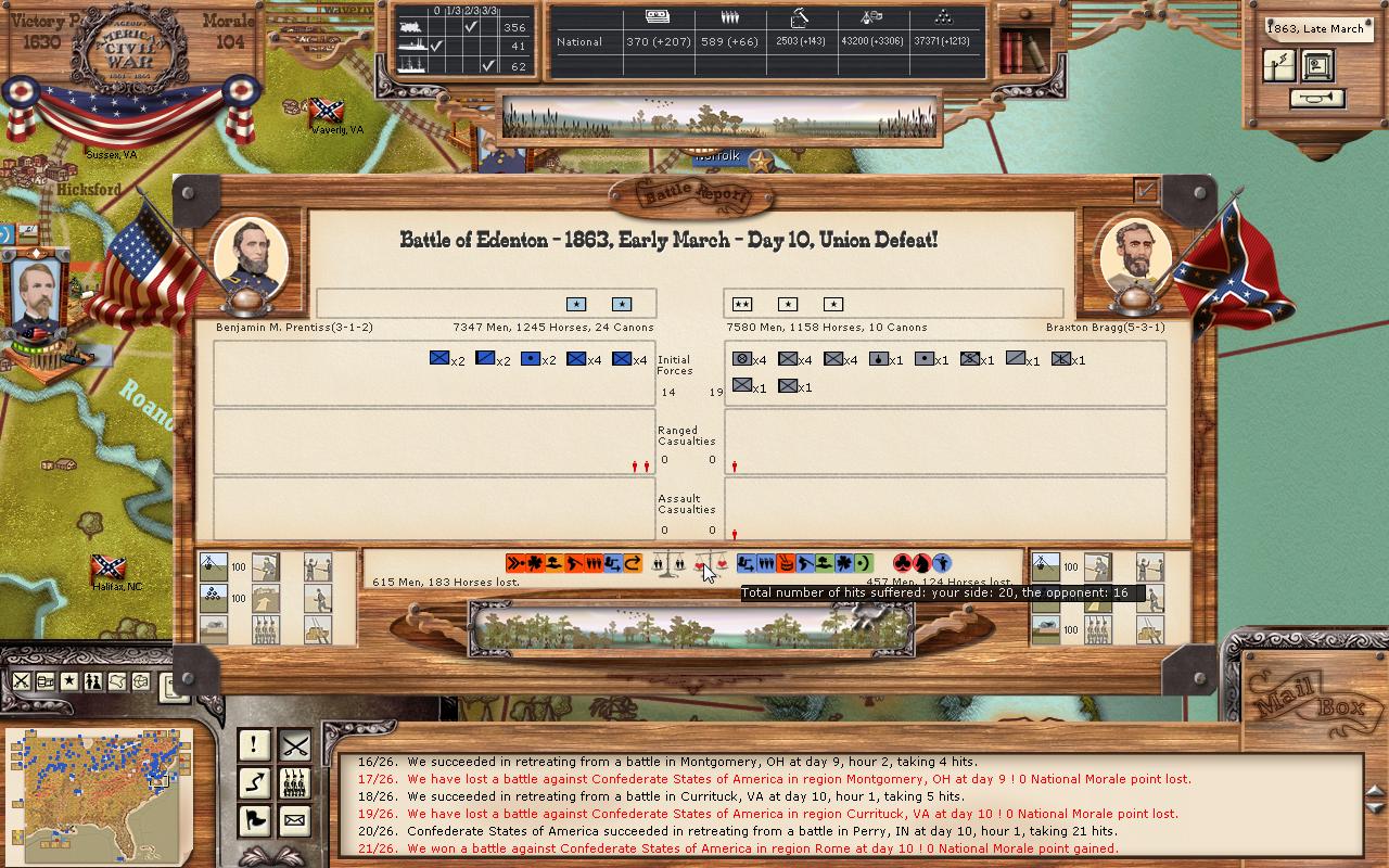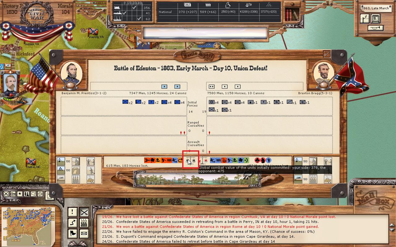 In the swamps of NC, a minor battle has shaped up at Edenton. Benjamin Prentiss is trying to force Braxton Bragg back. The number of troops and artillery make it look like an even fight, don't they? In fact the Union has a two to one advantage in artillery.