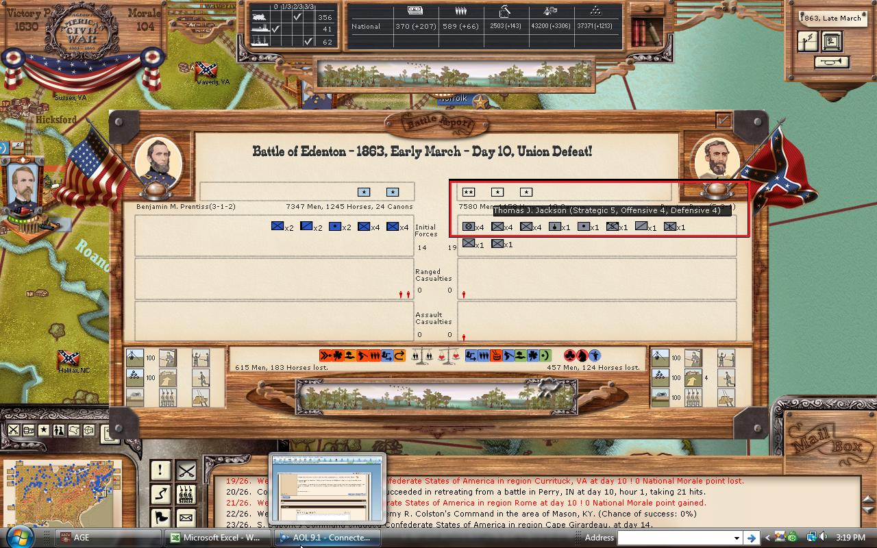 The fact that CSA general Johnston loses 3 infantry elements in a first fight is a clue to the depleted condition of CSA regiments in his exhausted army at this point. There are simply few replacements left in the pool to bring units up to full strength. What YOU don't know is that blockade % has been at 100% since summer and no other CSA conscipt cities exist. He's out of gas.