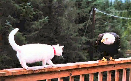 Interesting picture of the cat and the eagle. Nice eagle, and I cannot believe the cat wanted to take it on, and I cannot believe the eagle let the cat get that close. In any case the eagle looks more incredulous than frightened. You wanna piece of me?