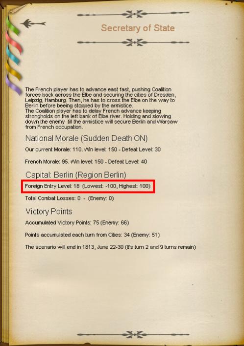 The Foreign Entry Level is high and close to the critical 100 value that will trigger the Armistice and the anticipated end of the campaign.