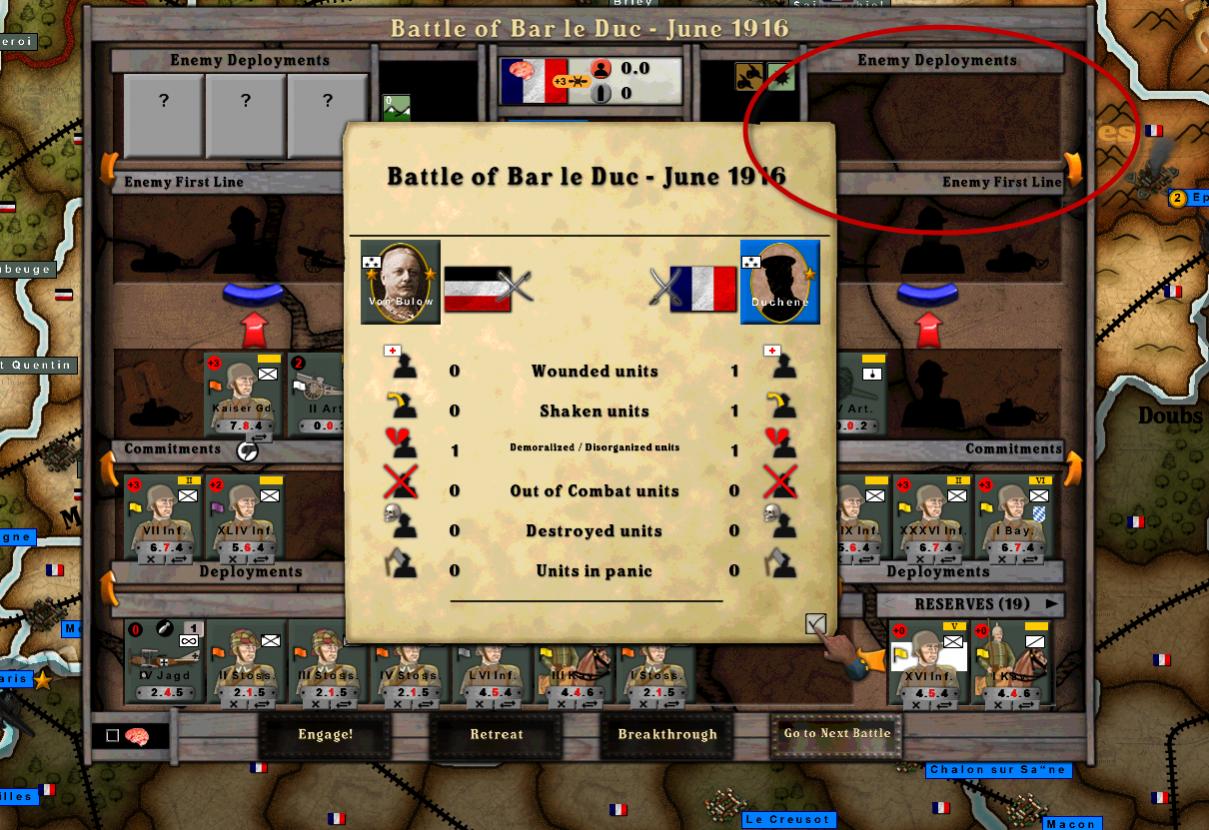 First, my attack by GE II Army on Bar le Duc terminates after one round for no apparent reason, and the Germans lose the battle. (see "Grand Offensive 1 round" attachment) Germans have lots of corps yet to commit, and the French have nothing in one of the sub battles after round 1 (note the empty French deployment box in the upper right corner).