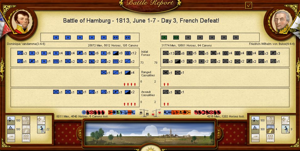La AI es mucho más pasiva, aunque basicamente mi oponente ha jugado a la defensiva, lo que me permitía tomar rápidamente Hamburgo y avanzar por el norte del Elba hacia Berlín, lo que con el avance de Eugene al sur del Elba se formaba una pinza de efectos devastadores. En este caso mi fallo ha sido no avanzar antes con Eugene tras la falta de resultados en Hamburgo